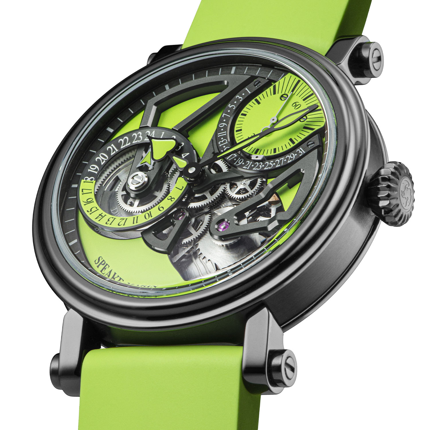 Speake-Marin’s dual time with retrograde date is back in a hot contemporary blend of lime green and matte black DLC-coated titanium. Speake-Marin might be based in Switzerland, but its watches are true to the British heritage of the brand, where eccentricity of the sartorial and mechanical type reigns supreme. The brand’s signature off-centred layouts and the impossible-to-mistake Piccadilly case return with the Dual Time Lime. With its partially openworked dial and eye-catching colour, the Speake-Marin Dual Time Lime could be an ideal wrist companion for a spin in your convertible lime green McLaren 600LT Spider.