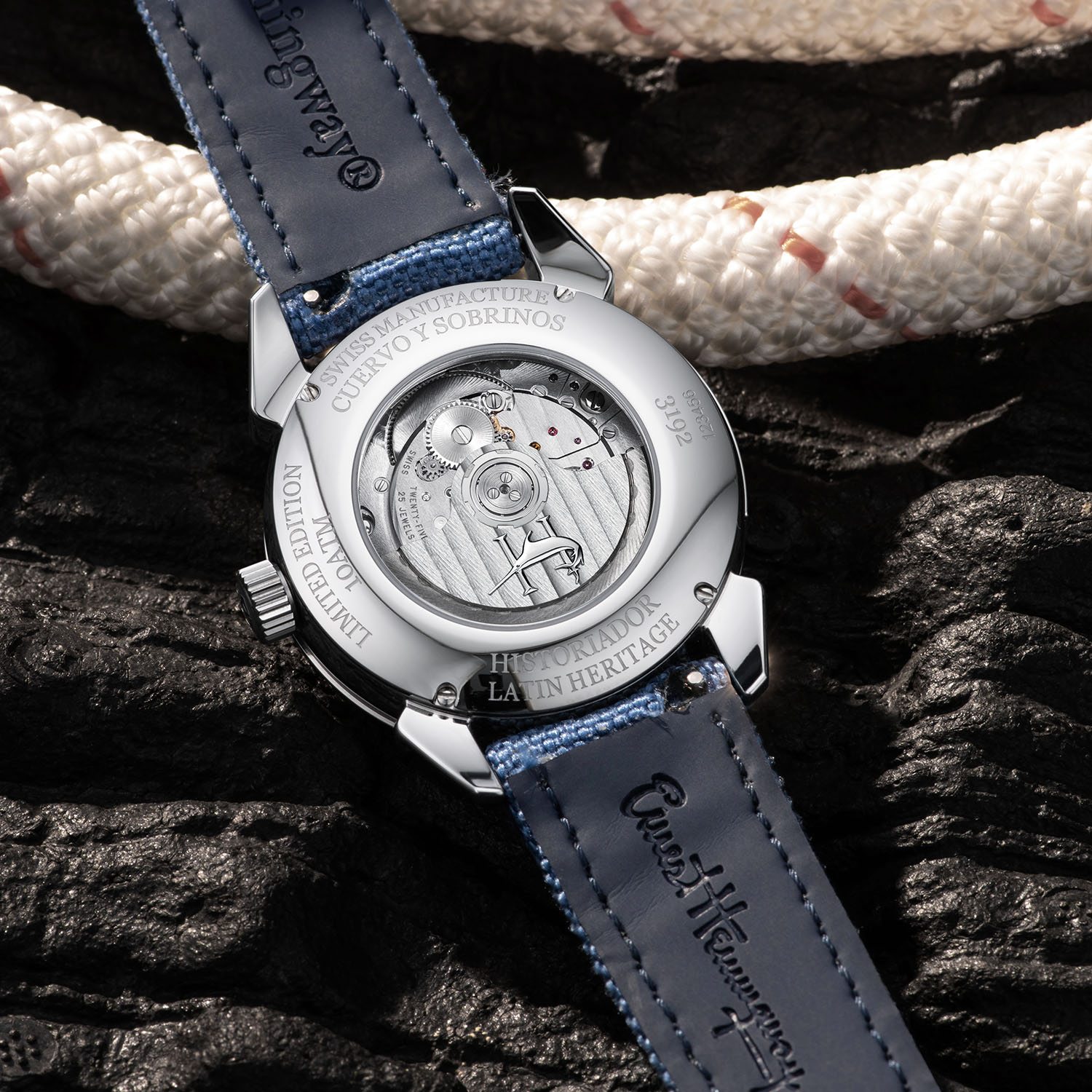 With its ocean blue dial, the Historiador Hemingway Fisherman pays homage to Hemingway’s novella, The Old Man and the Sea, written in Cayo Blanco. A limited edition of 288 models, the Fisherman is a GMT watch with a 24-hour scale on the bezel. Slightly less retro in spirit than the Icónicos, the Fisherman comes on a metal bracelet and reveals its movement through a sapphire crystal on the caseback.