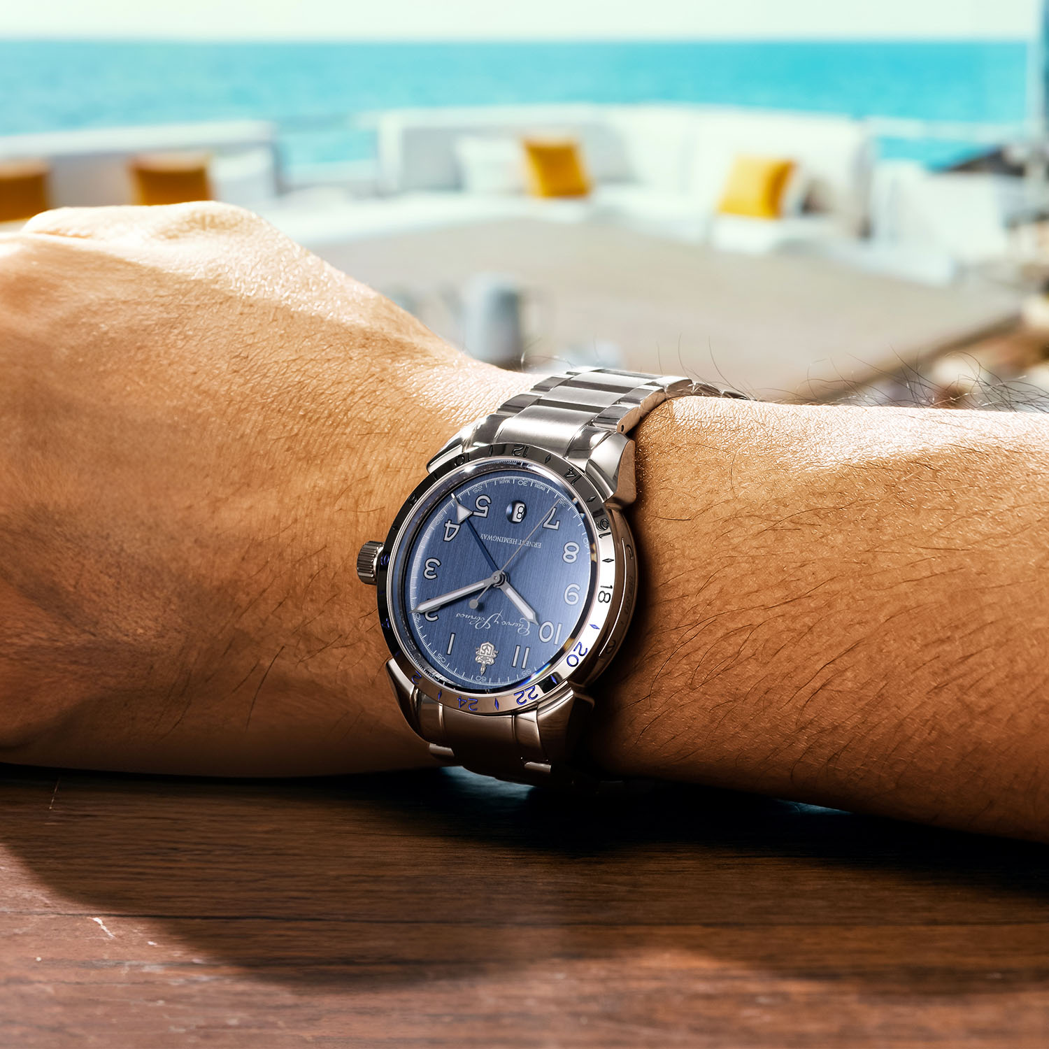 The blue dial features a vertical brushed finish and matches the colour of the engraved numerals of the 24-hour GMT scale on the bezel. The hand used to indicate the GMT scale is a slightly lighter tone of blue and has a luminous arrow-shaped tip. Like the Icónico models, the brand’s coat of arms is applied at noon, and the Arabic numerals and hands are treated with Super-LumiNova. In addition to the time and date functions, there is a round date window at 6 o’clock.