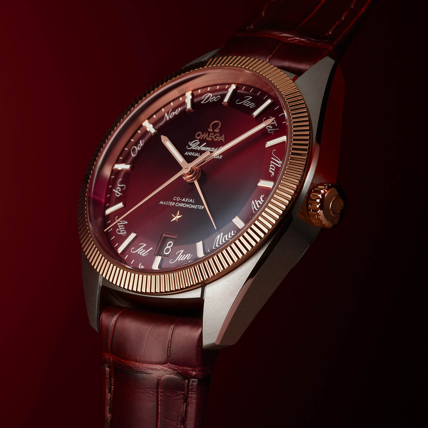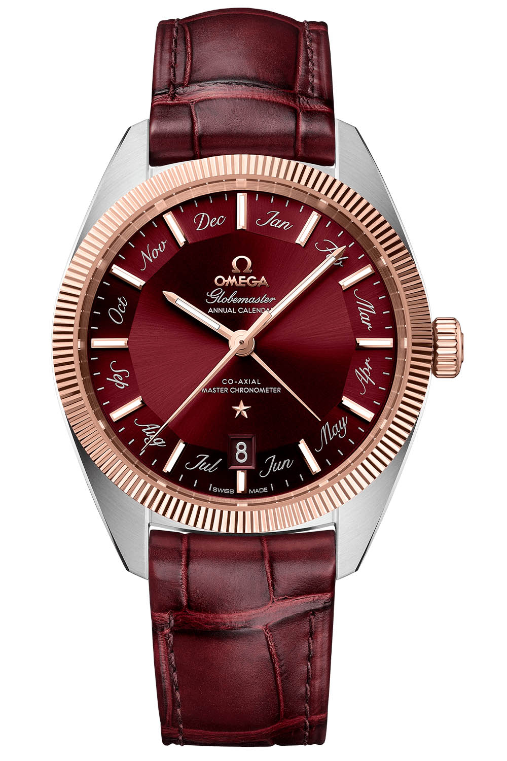The second model to join the Omega Globemaster Annual Calendar collection is probably both the boldest and the most visually attractive. Its case combines stainless steel for the central part and the caseback, with a fluted bezel and a crown made of 18k Sedna Gold – Omega’s exclusive red gold alloy. The dial, with its deep burgundy colour, is sunray-brushed and all the elements – hands, logos, applied markers – are made of Sedna gold too. This version (ref. 130.23.41.22.11.001) is complemented by a colour-matching alligator strap with a steel folding clasp. It will be priced at EUR 11,100.