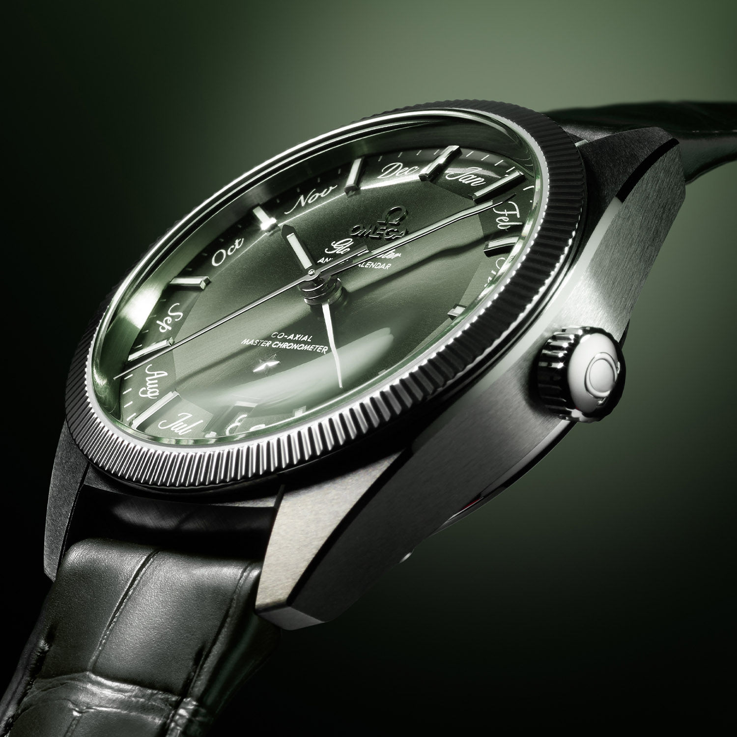 Part of the three new models is a new green model, housed in a stainless steel case. The case has brushed surfaces with polished accents and its bezel is made of hard metal (tungsten carbide) for extra strength and resilience. The dial, with a deep green sunray-brushed pattern, features 18k white gold elements for the facetted hands, the Omega logo, the applied indexes, and the Constellation star. This version (ref. 130.33.41.22.10.001) is worn on a matching green alligator strap. It will soon be available from boutiques and priced at EUR 8,300.