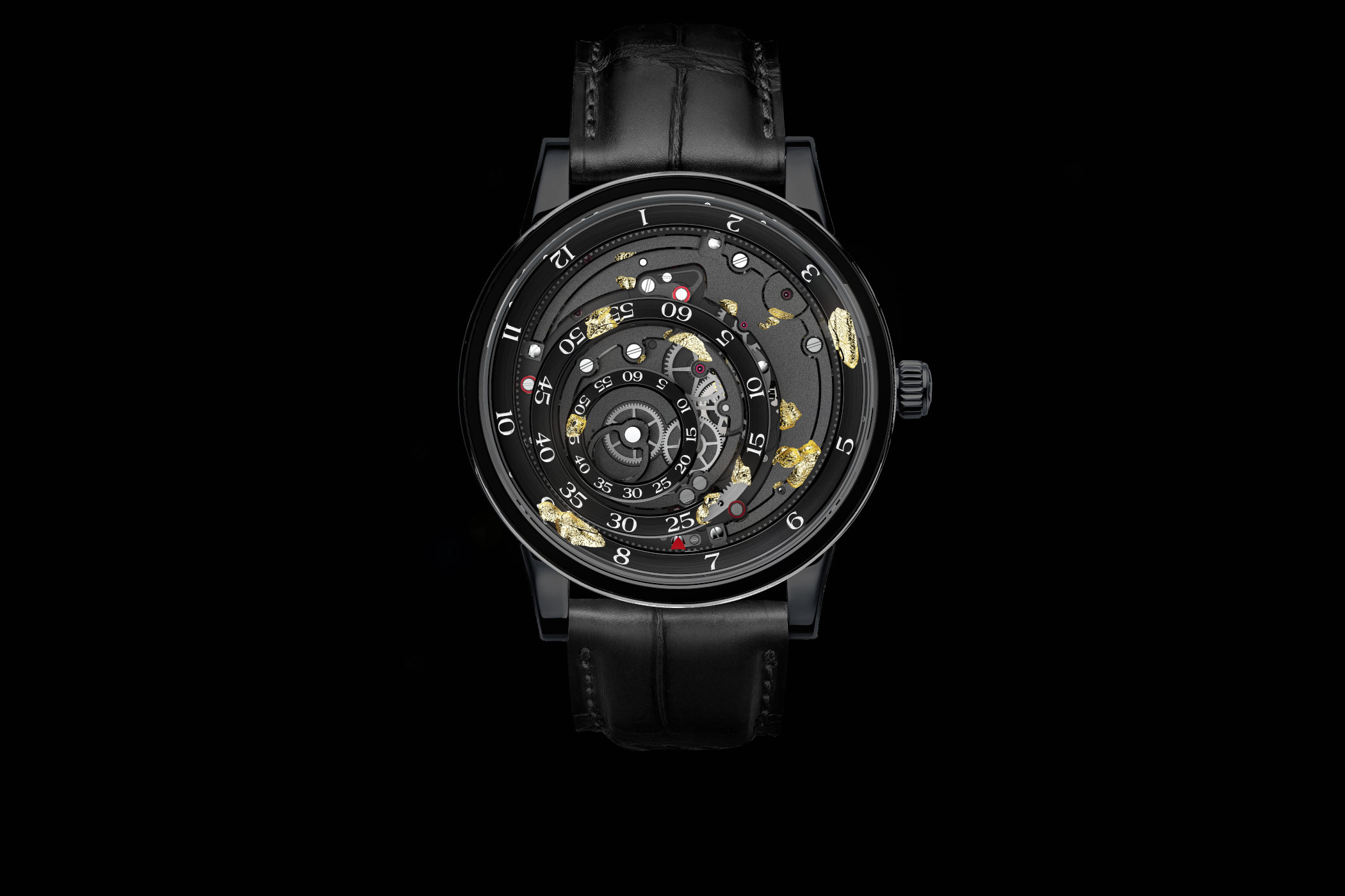 The micro-rotor movement driving the unconventional time display is the calibre X Centric with a 4 Hz frequency and 48 hours of autonomy. For this Only Watch unique piece, the modern matte-finished bridges and plates are decorated with gold leaf creating a striking contrast. The 40.5mm case comes in PVD-coated grade 5 titanium to complete the black monochromatic look.