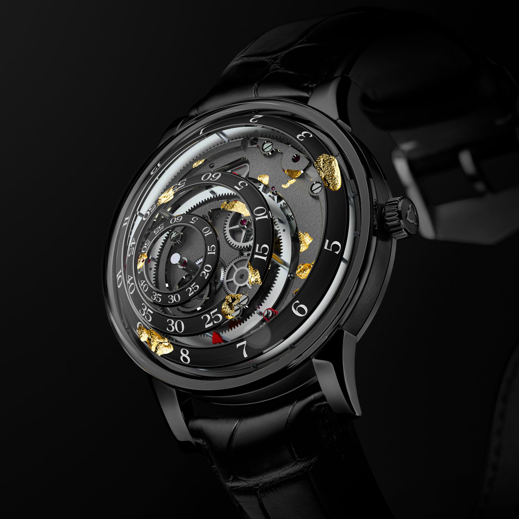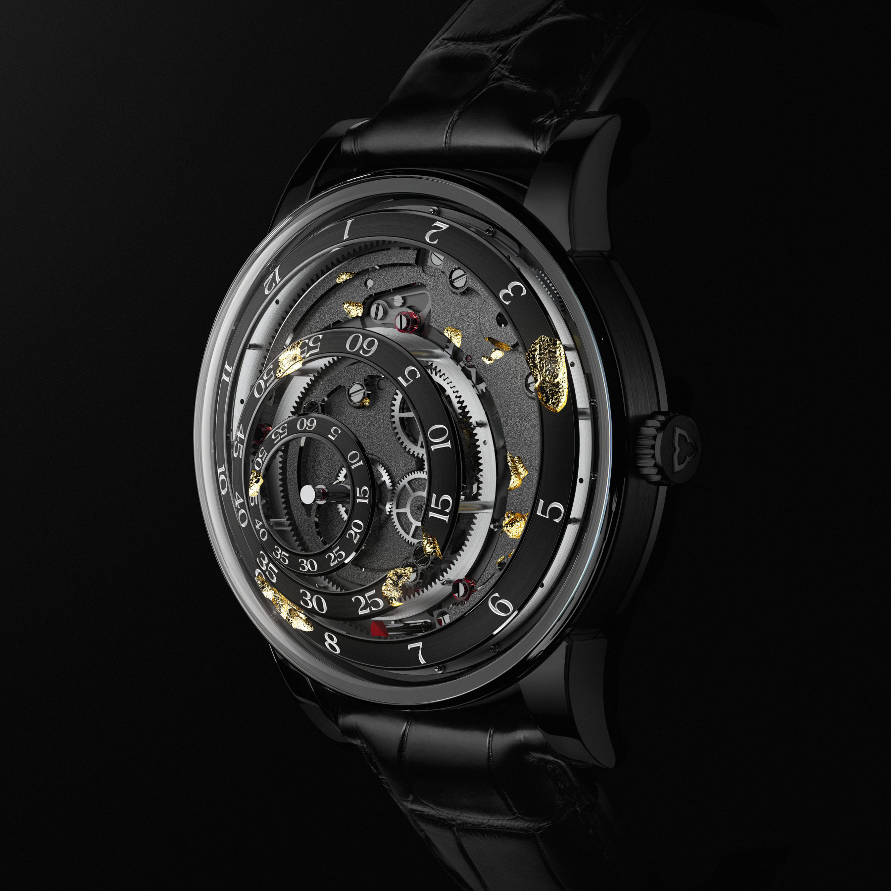 The micro-rotor movement driving the unconventional time display is the calibre X Centric with a 4 Hz frequency and 48 hours of autonomy. For this Only Watch unique piece, the modern matte-finished bridges and plates are decorated with gold leaf creating a striking contrast. The 40.5mm case comes in PVD-coated grade 5 titanium to complete the black monochromatic look.