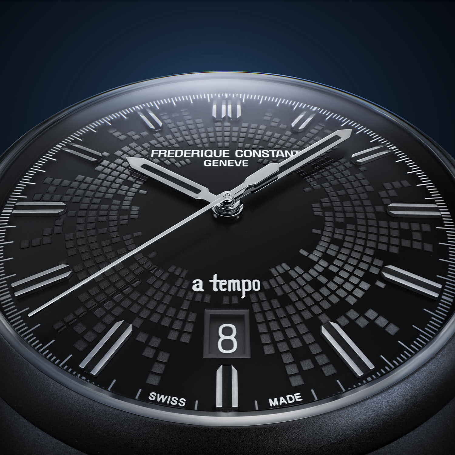 The dials are decorated with a pattern that evokes the sound waves of studio monitors. On the stainless steel edition, the blue sound waves traverse the dial against a black background, the shade of blue being the same colour The Avener used on the cover of his first album. The black PVD model differs in that the sound waves are depicted concentrically. ‘A tempo’ is printed just above the date window at 6 o’clock, reminding musicians to recuperate a normal tempo after a slow or fast section. Although both models feature applied steel indices, the twelve hour markers on the black dial are filled with black luminescent material matching the hour and minute hands; the blue dial, however, has fewer indices (12, 3, 6 and 9 o’clock) and the luminous material on the hour markers and hands appears to be white.