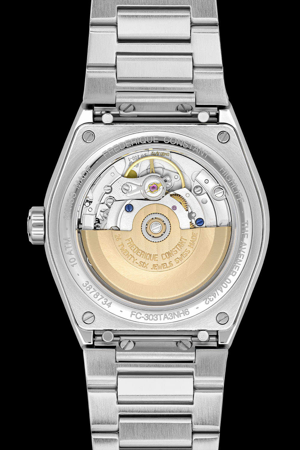 Powered by the automatic calibre FC-303 (base Sellita SW 200-1 without COSC chronometer certification), the movement can be seen on the reverse side of the case with its gold-coloured rotor delivering energy to the barrel for 38 hours.