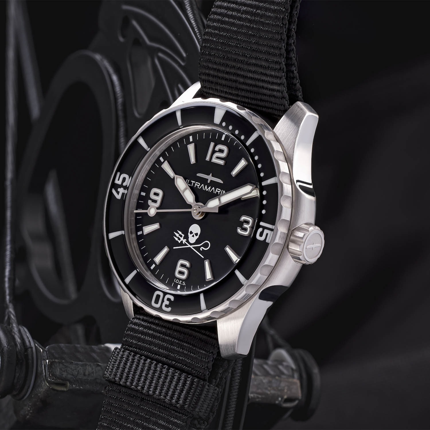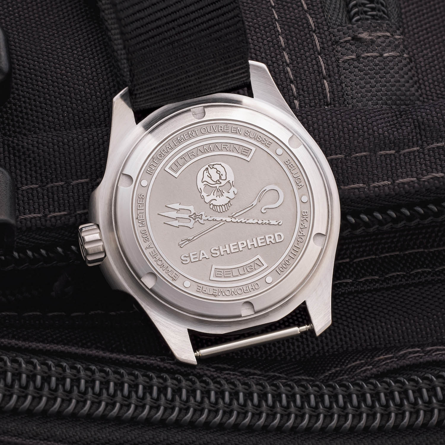 The Ultramarine Beluga will be available in four references: a blue dial and blue bezel, an ice blue dial and black bezel, or with a black and black colour combination. The number four, also black, is a little different, as it is a special 100-piece limited edition of the Ultramarine Beluga, launched to support the Sea Shepherd Conservation Society, with “a sole mission is to protect and conserve the world’s oceans and marine wildlife“. The dial of the Beluga Sea Shepherd bears a skull with a shepherd’s crook and Neptune’s trident, the N.G.O.’s logo, and the caseback is also decorated with this image. Ultramarine will donate EUR 800 to the Sea Shepherd from every special edition watch sold, which could add up to 80k. A sizable donation.