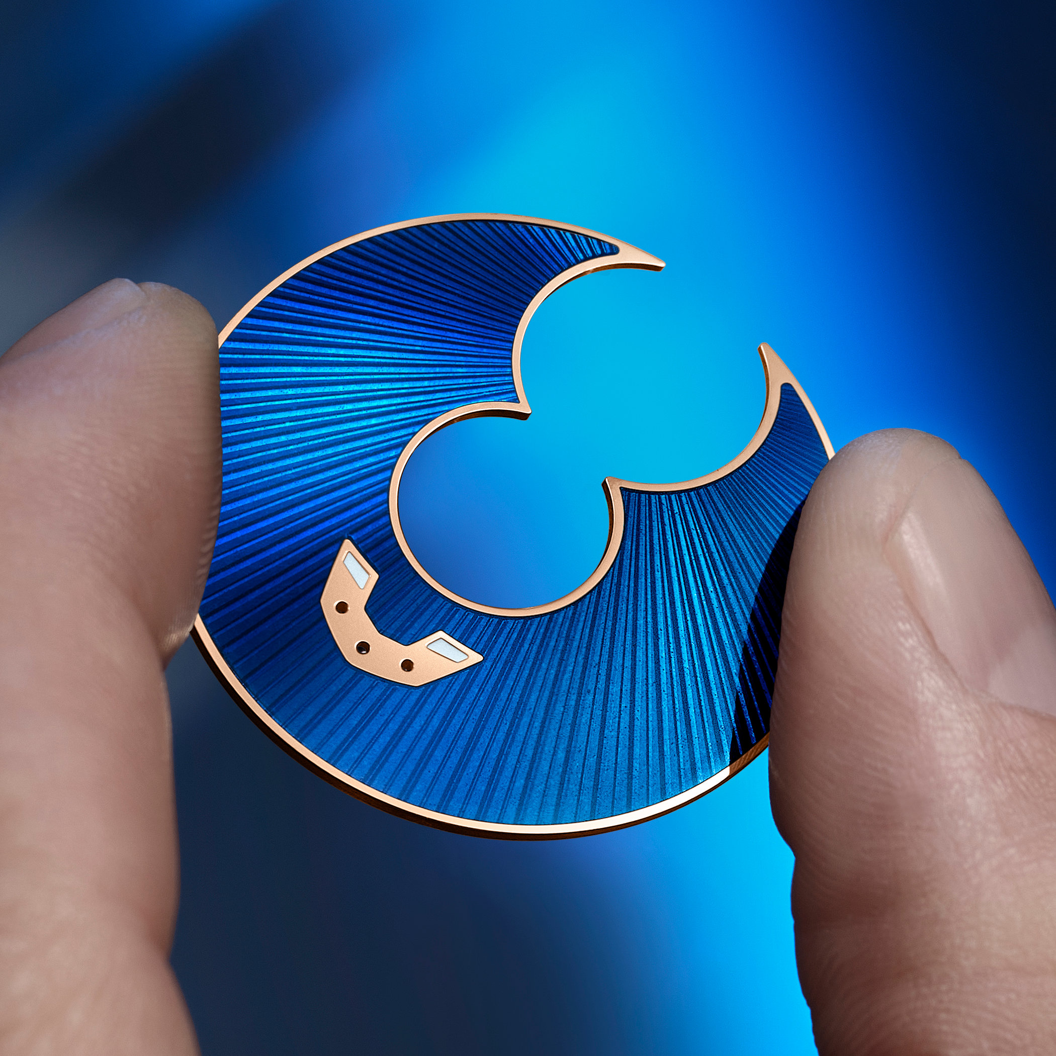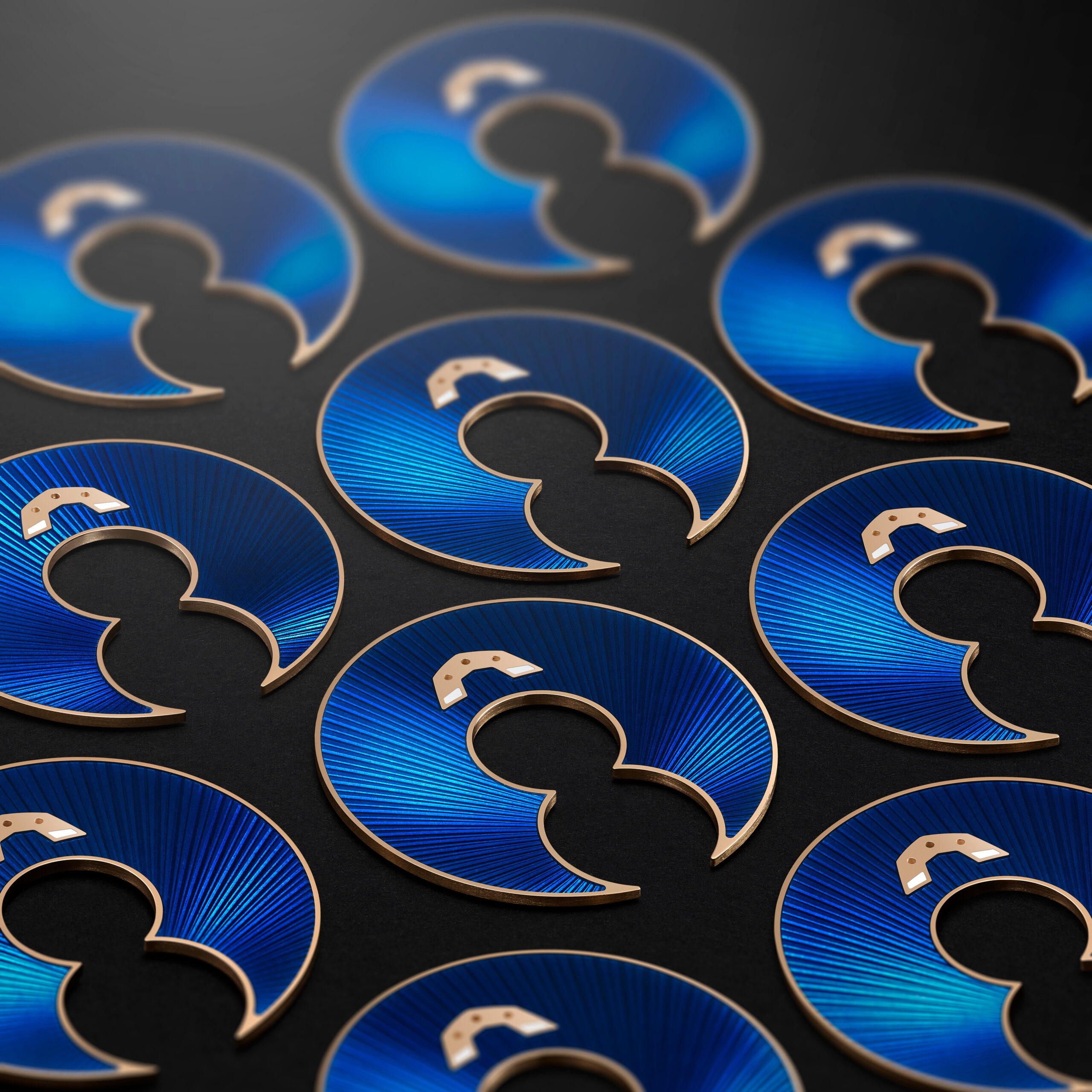 The Freak X is easily identifiable by its conventional crown, which was absent on the original Freak, the brainchild of master watchmaker Ludwig Oechslin. Making its debut in 2019, it was intended to be a more simplified and accessible version of the groundbreaking concept, without compromising its true spirit. Since then, we’ve seen it with an Aventurine dial, a dizzying Razzle Dazzle dial, and even a silicon marquetry dial. Admittedly, the word dial isn’t exactly fitting, as it’s more the top mainplate of the movement. Now, though, it gets a stunning guilloché mainplate, with blue enamel to finish it off. This is set in a rose gold and blue PVD-coated titanium case of 43mm in width and 13.38mm in height.