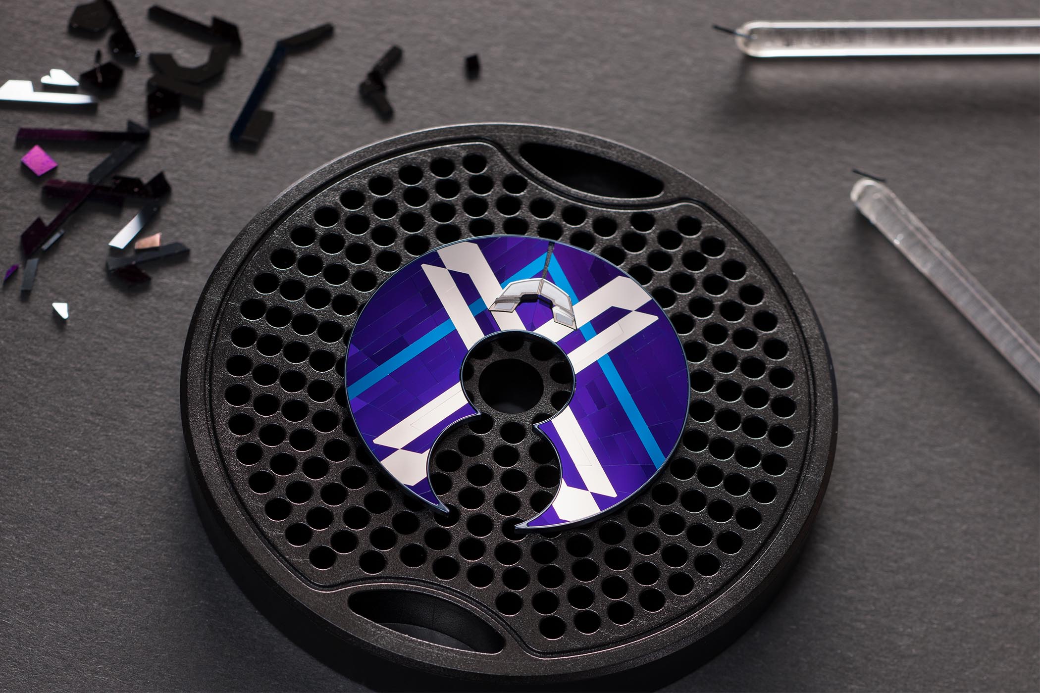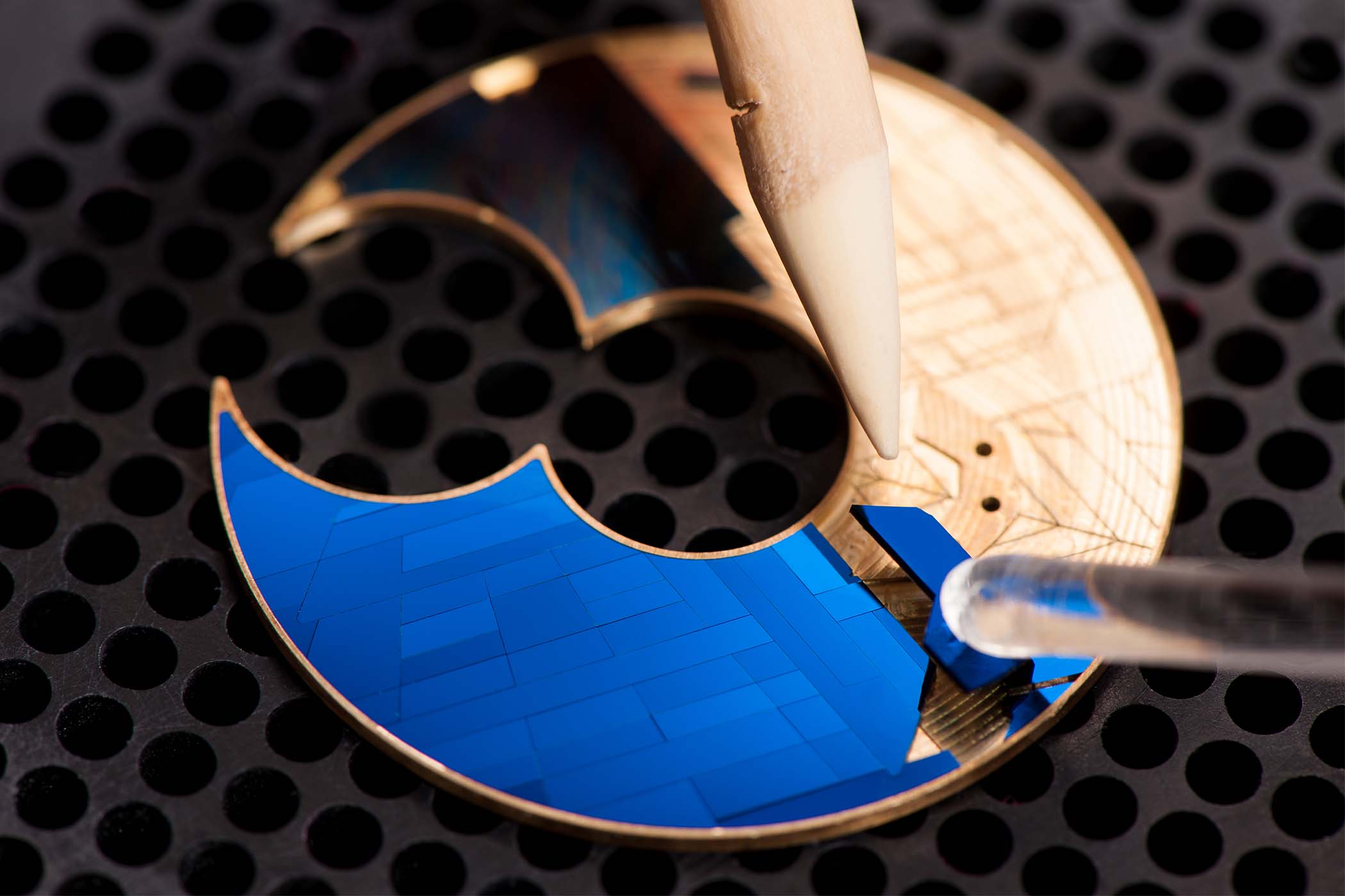 Silicium marquetry involves assembling wafers of silicon cut into segments with a plasma accelerator. All the subtlety of this technique lies in the craftsman’s dexterity, given that the silicon used is extremely flaky and fragile when manipulated. Slightly superimposing the segments one on top of the other, rather than interlocking them, will be enough to chip their edges. Assembling by hand a collage of the roughly 120 segments needed to create these mosaics is a challenge.