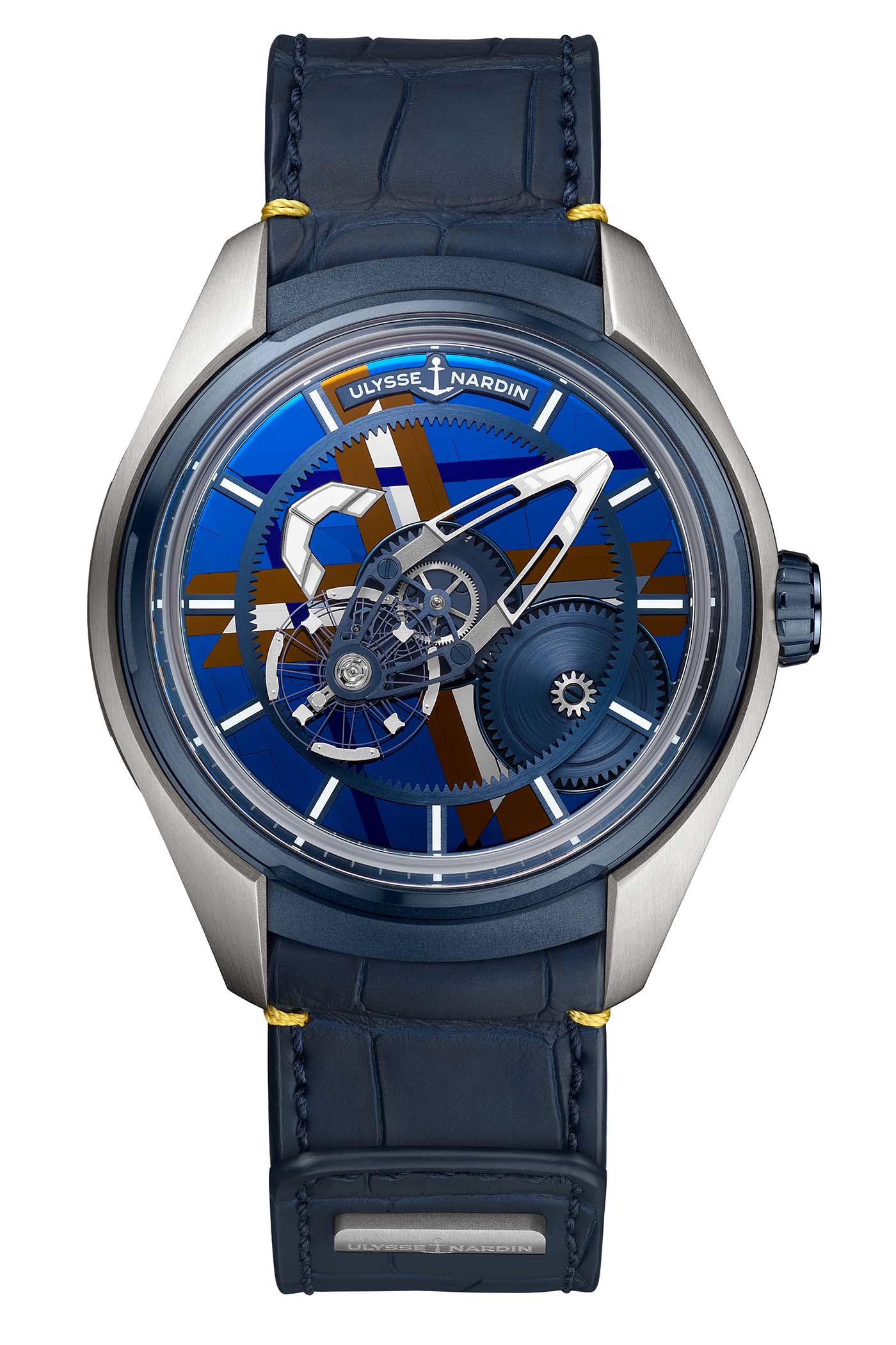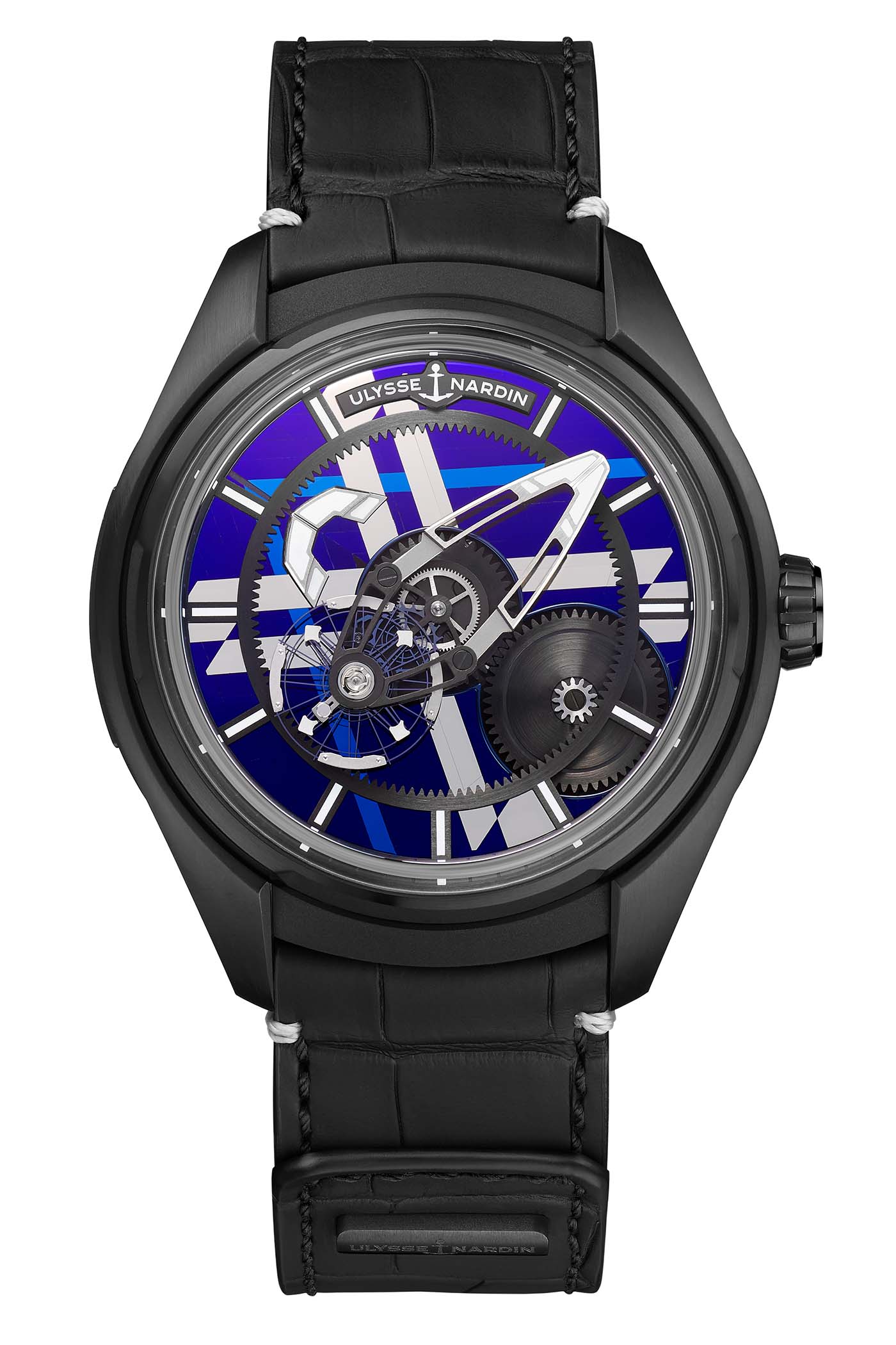 Two versions of the Ulysse Nardin Freak X Silicium Marquetry will be available. The first, in titanium and blue PVD, shows a gilded “X” on a cameo of shades of blue. The second, decorating the dial of a black DLC-coated model, depicts a silvery “X” on a purplish-blue background.