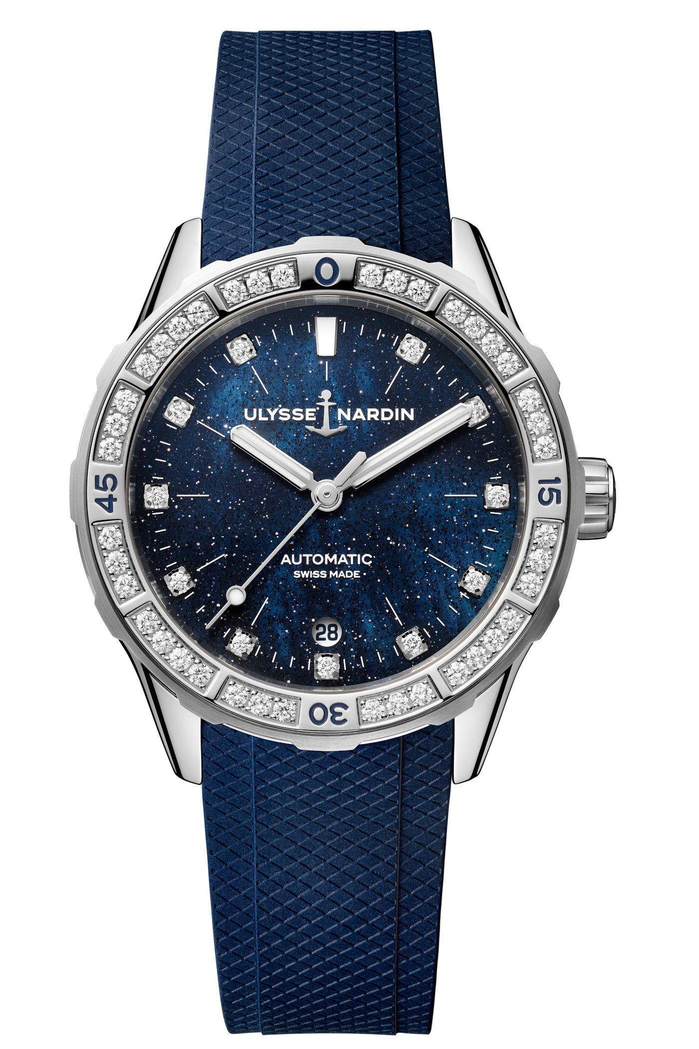 The Ulysse Nardin Diver Starry Night introduces a different aesthetic, housed in a 39mm stainless steel case and adorned with a bezel set with 40 diamonds. The dial is a captivating composition of two plates – a bottom layer of mother of pearl and a top layer of aventurine, resulting in an effect that evokes the ethereal beauty of the Milky Way. Serving as hour indices, 11 diamonds grace the dial, while the hands and a 12 o’clock-shaped index are coated with Super-LumiNova for enhanced visibility. A small round aperture at 6 o’clock discreetly displays the date against a white background.