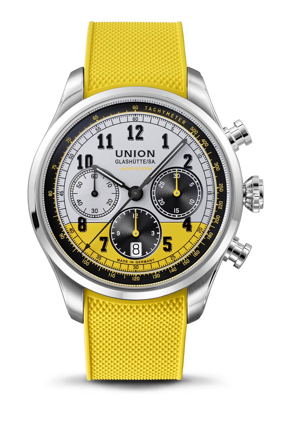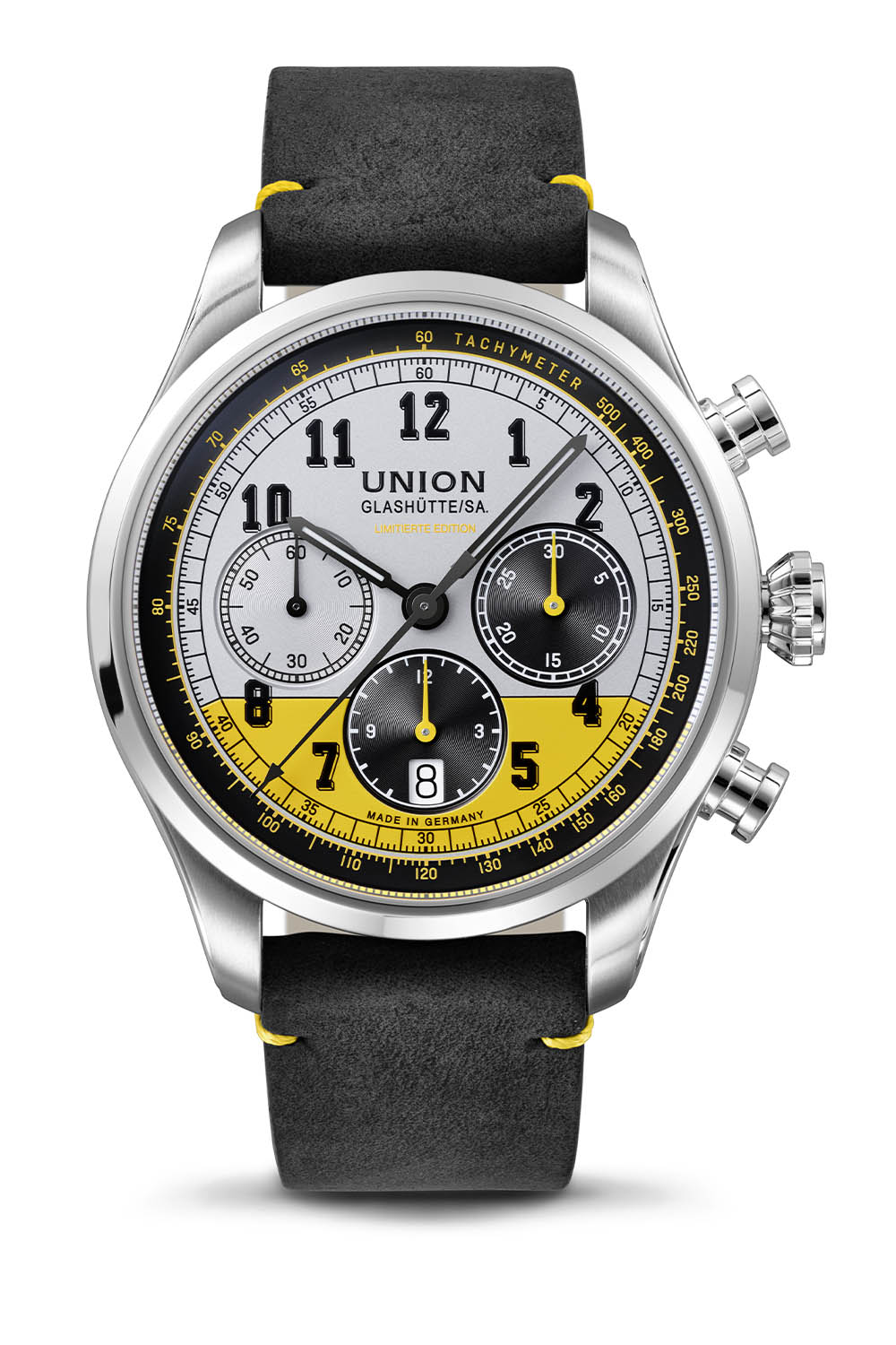 The upper part of the base dial is silver coloured, reminiscent of the car body metallic paint, while the lower part is very bright, racing yellow. The black tachymeter scale with yellow print on the periphery seems pushed out as if by G- force, bordered by the chemin de fer chapter minutes ring. The sub-dials are laid out in a 3-6-9 fashion and share a snail-finishing texture. The 30-minute and 12-hour totalisers at 3 and 6 o’clock are anthracite black, and the 60 seconds sub-dial is grey, matching the base dial colour of the upper part. The 12-hour counter has a cut-out window showing the date in black on white background. The yellow is also present to indicate the Limitierte Edition marking under the Union Glashütte logo; sub-dial hands at 3 and 6 are painted yellow, too. The printed 3D-style hour indexes are enormous and black and should be easy to read when there is light. In the dark hours, luminescent hands will do the job of telling time.