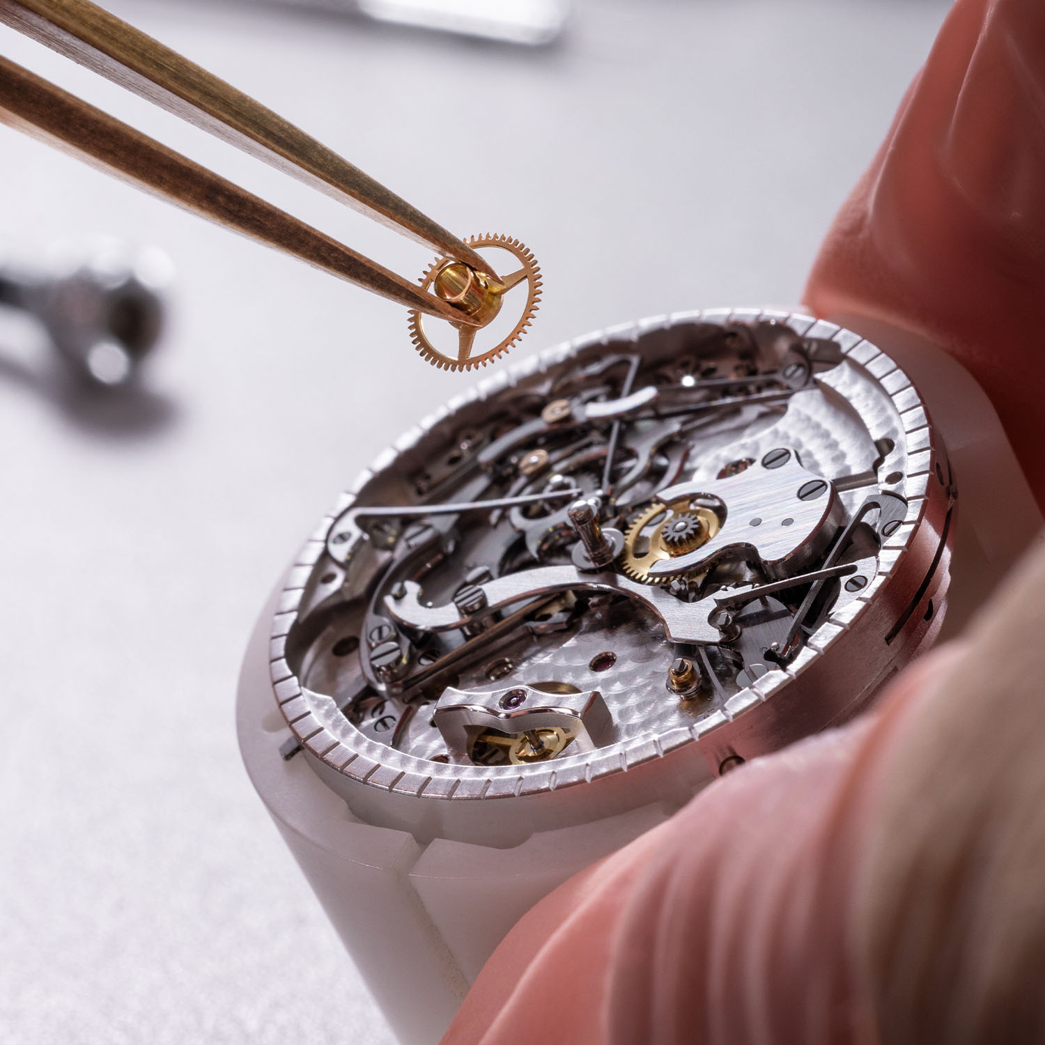 The extra-long cathedral gongs that wrap almost twice around the movement deliver a rich, deep tone. Each hammer is engineered to strike with millimetric precision, producing distinct chimes for the hours, quarters and minutes. Developed by Renaud Papi, the manual-winding movement has an autonomy of 72 hours and the hollowed-out back and sides of the case amplify the sound. Similar to the movement of the Toric Quaestor Labyrinthe, the power is transferred to the complication via a flywheel, ensuring total mechanical silence and constant energy for the spring when needed.