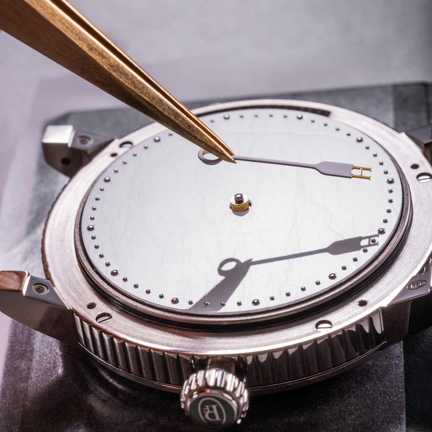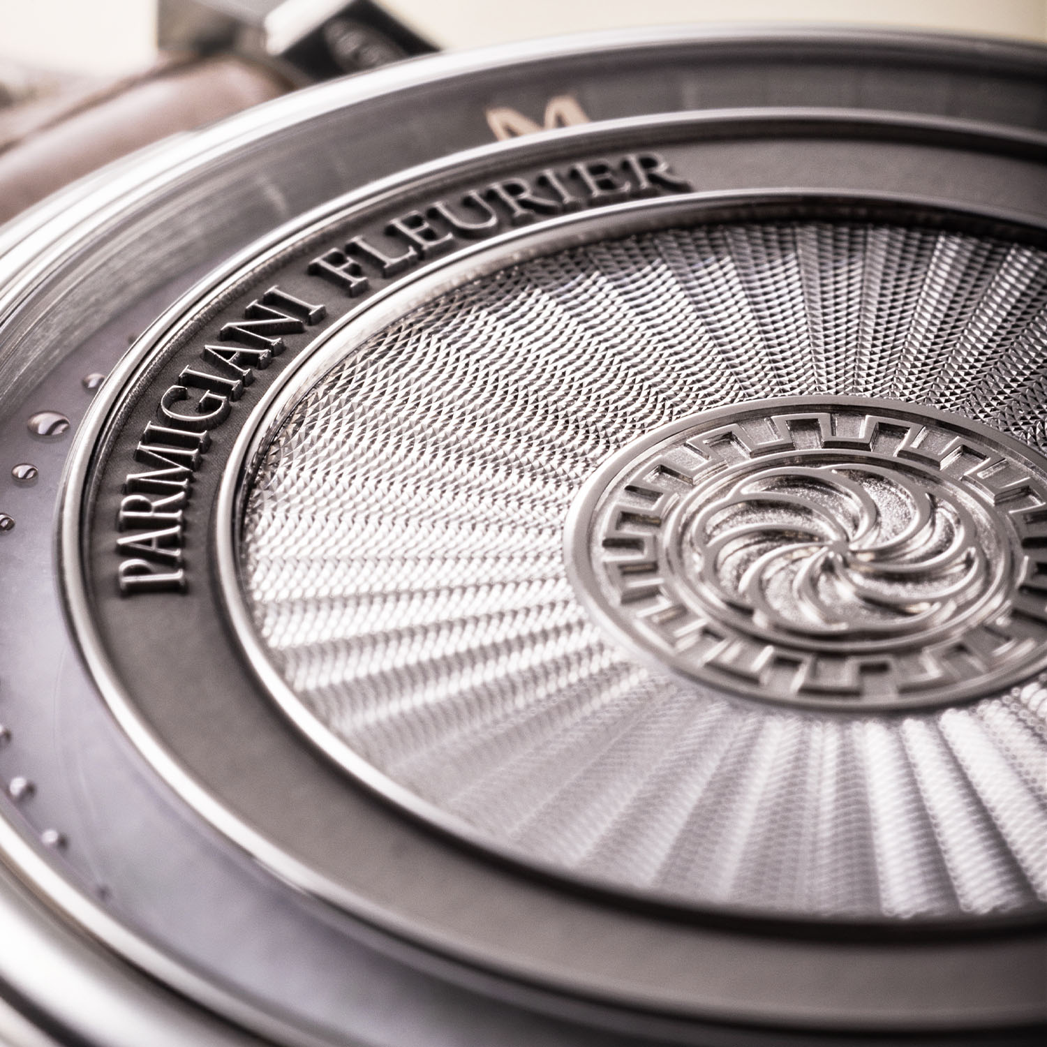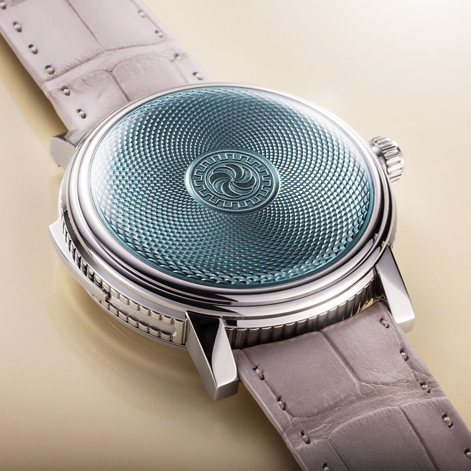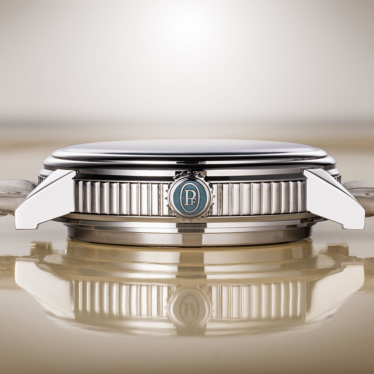 The 18k white gold case has a thickness of 12.65mm and reflects Michel Parmigiani’s passion for classical references. The wide and slightly rounded fluting on the case middle, for example, emulates the profile of Doric columns, while the geometric design on the cover and caseback is inspired by the Fibonacci sequence, a mathematical sequence of numbers associated with the Golden Ratio that occurs in nature with snail shells, pinecones, sunflower heads, etc. Fitted with straight, angular lugs and polished throughout, the slider for the minute repeater is inserted on the left case flank, and the 6.4mm crown is decorated with Grand Feu enamel to match the cover.