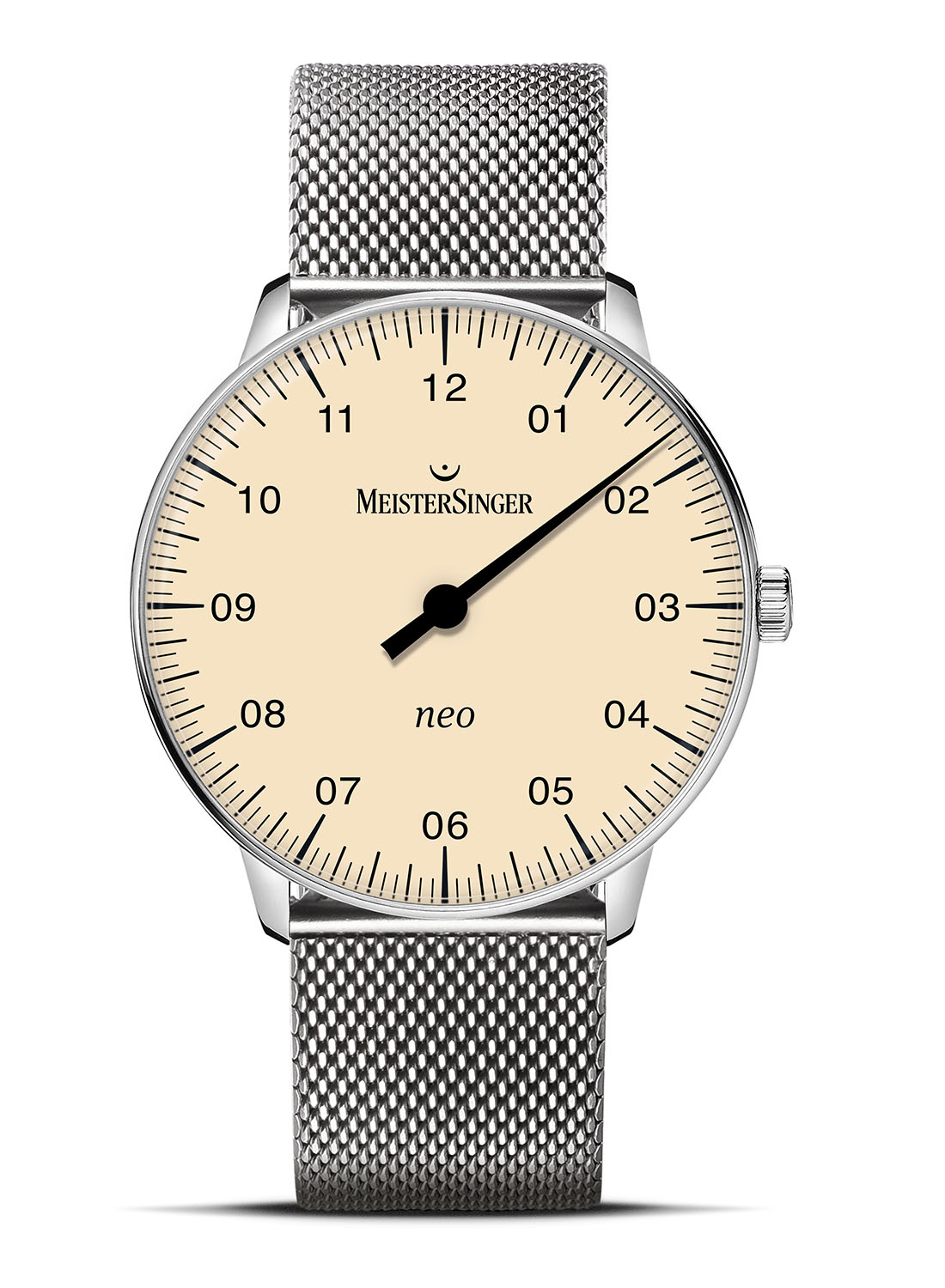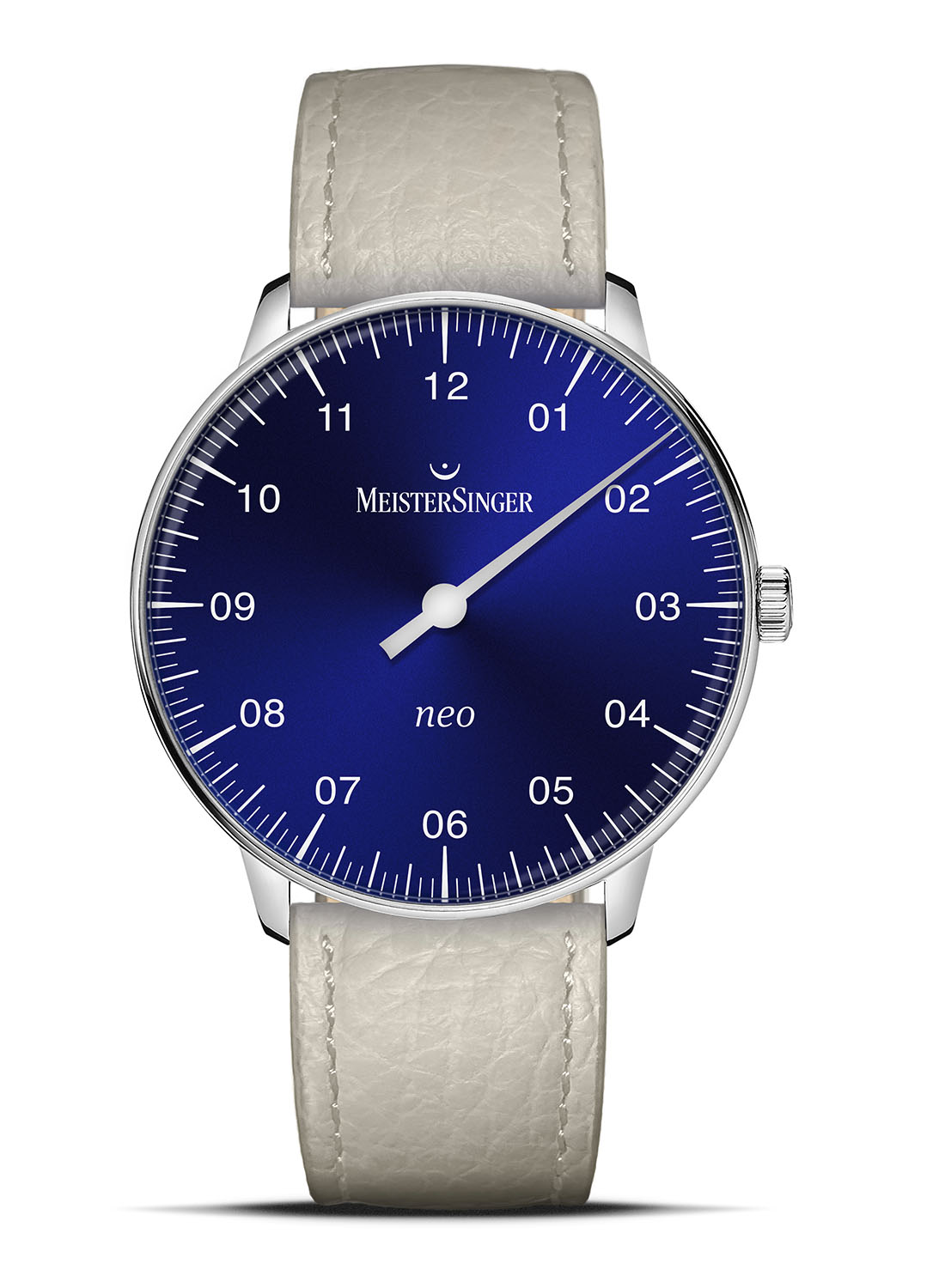 The three MeisterSinger Neo references from the new generation come with the option of either a finely meshed Milanese bracelet or a grained cowhide leather strap in pine green, cream white, or ocean blue to complement the ivory, blue, or white dial versions, respectively. The price has slightly increased, with the new Neo watches retailing for EUR 1,890 and already available.