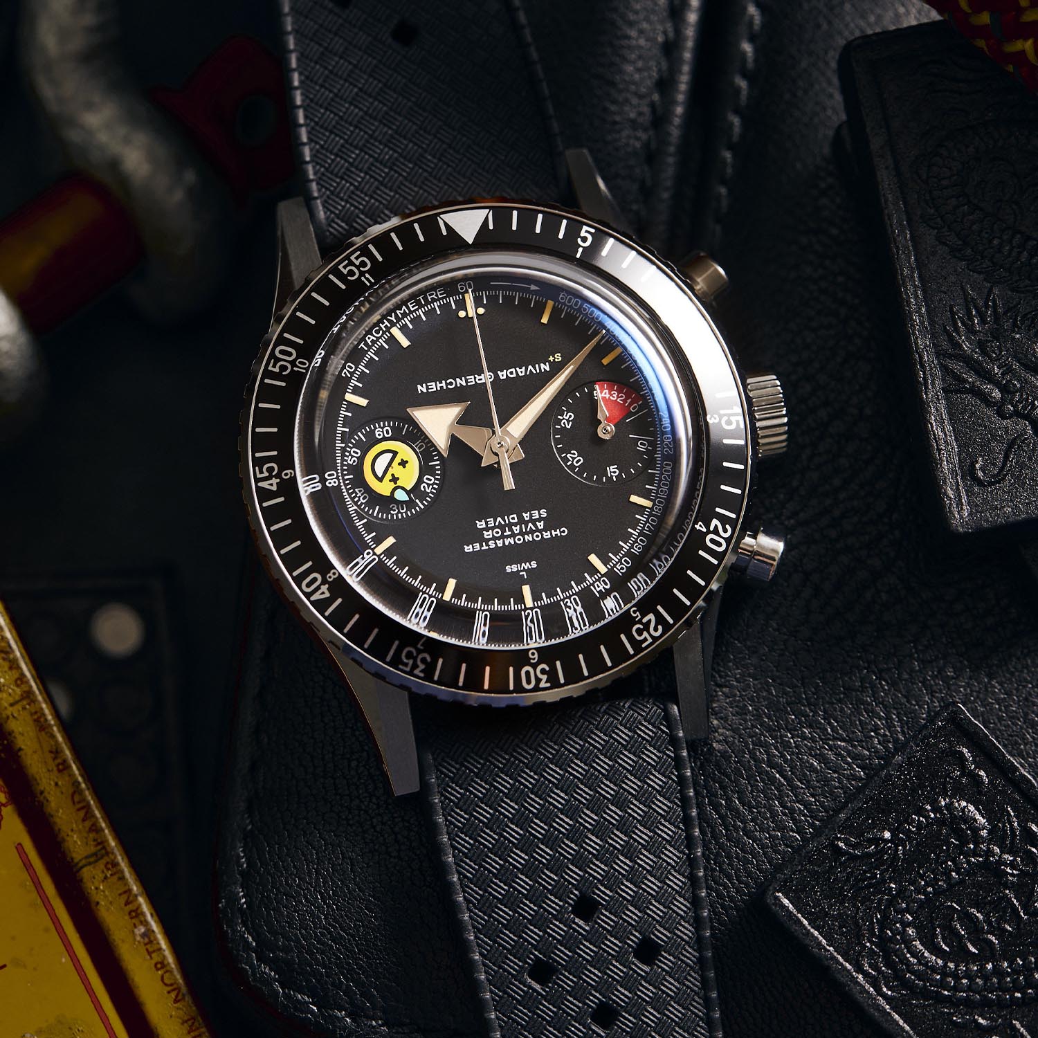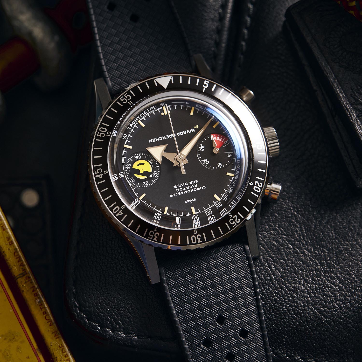 So, this new watch is using the base of the Chronomaster Aviator Sea Diver. This means; historical look, 38.5mm diameter, stainless steel case with brushed and polished surfaces, elements from racing watches, pilot’s watches, dive watches, all blend in a single watch with tachymeter scale and 12-hour and 60-minute rotating bezel, and in the present case, a hand-wound Sellita chronograph movement. And yes, the base dial is still the classic matte black one, with the beige-toned broad arrow hands. So the base is cool, well-established, and respected by many.