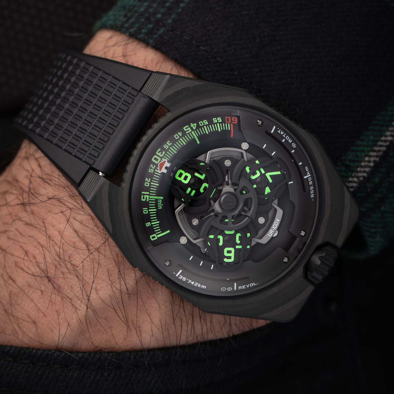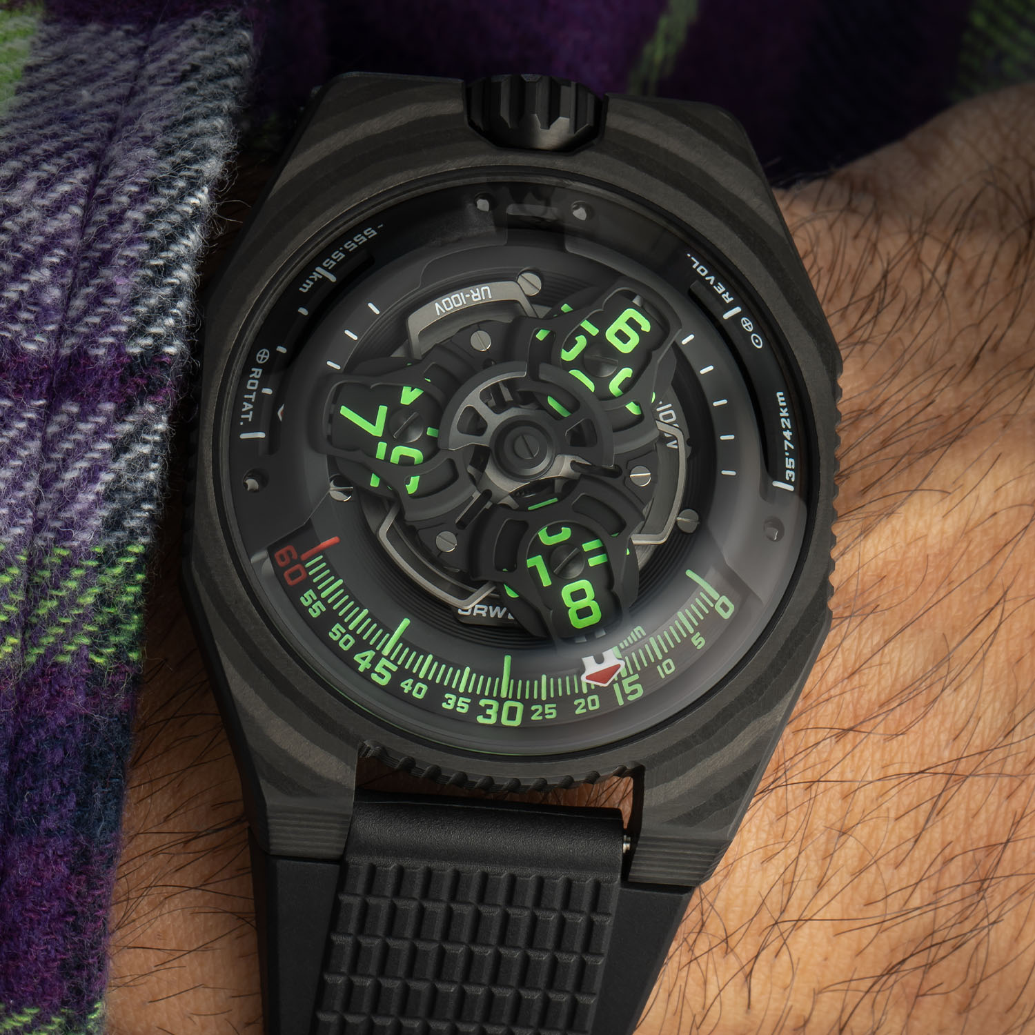 A featherweight carbon case, a textured rubber strap and Urwerk's primary palette of neon green and black for the latest UR-100.