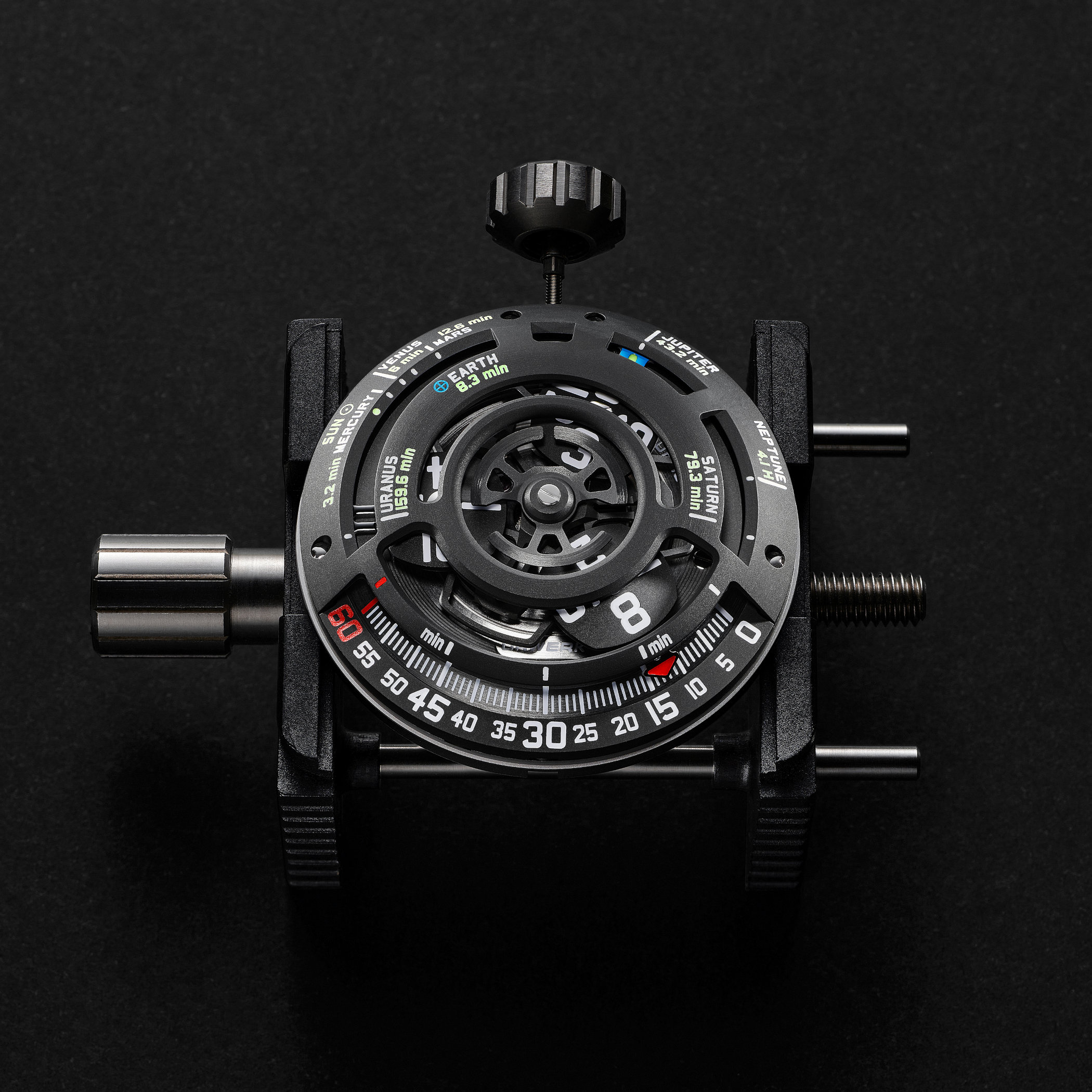 To represent the fastest speed anything in the universe can go, or massless particles of electromagnetic energy (photons) as they travel at a constant speed of around 300,000 km/s through empty space, Urwerk represents the eight planets and the exact time required for light to travel from the Sun to that planet (for example, sunlight reaches Mercury in 3.2 minutes, Earth in 8.3 minutes, and at the end of the scale, Neptune in 4.1 hours) on the domed, openworked black structure hovering over the wandering hours mechanism. More than a static representation, the small blue and green hand that appears in the openworked areas indicates the planets and is attached to one of the three carousel arms to complete a full turn around the dial in three hours. Once it has reached Saturn at 3 o’clock, it dips under the minutes track and resurfaces at 9 o’clock.