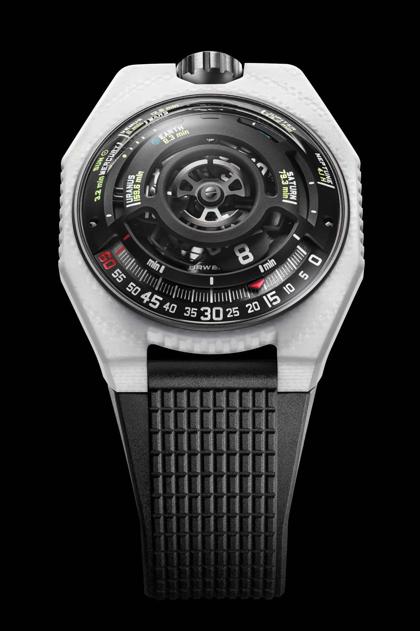 True to the displays found on other Urwerk models, the hours are indicated by three revolving satellites, with a red arrow-tipped minutes hand that travels along a 120-degree arched track graduated from 0 to 60. For enhanced legibility, the hours and minutes are painted with Super-LumiNova.