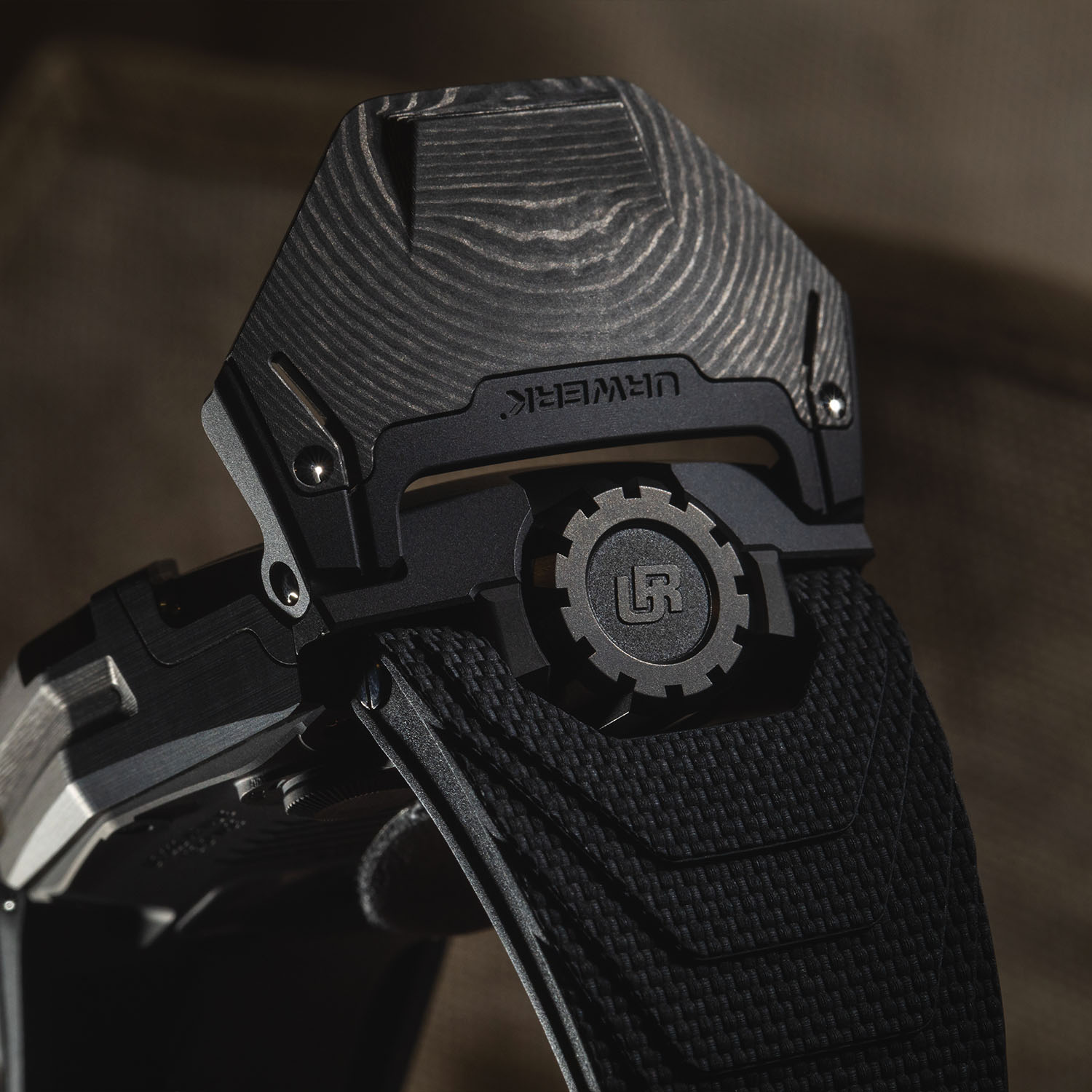The UR-230 arrives in a newly developed yet familiar, aerodynamic-shaped, black DLC-treated titanium and CTP (carbon thin-ply) carbon case, now equipped with a mobile cover crafted from the same material to protect the sapphire crystal. The cover has a “beak-shaped” edge for easy lifting to view the whole of the dial, and a specially developed braking device ensures a gentle closure, assuring the lid gently rests on the sapphire crystal and clips into place. With dimensions of 44.81mm in width, 53.55mm in length, and 18.38mm in thickness, the UR-230 is a sizable timepiece, something undoubtedly Urwerk enthusiasts are accustomed to.