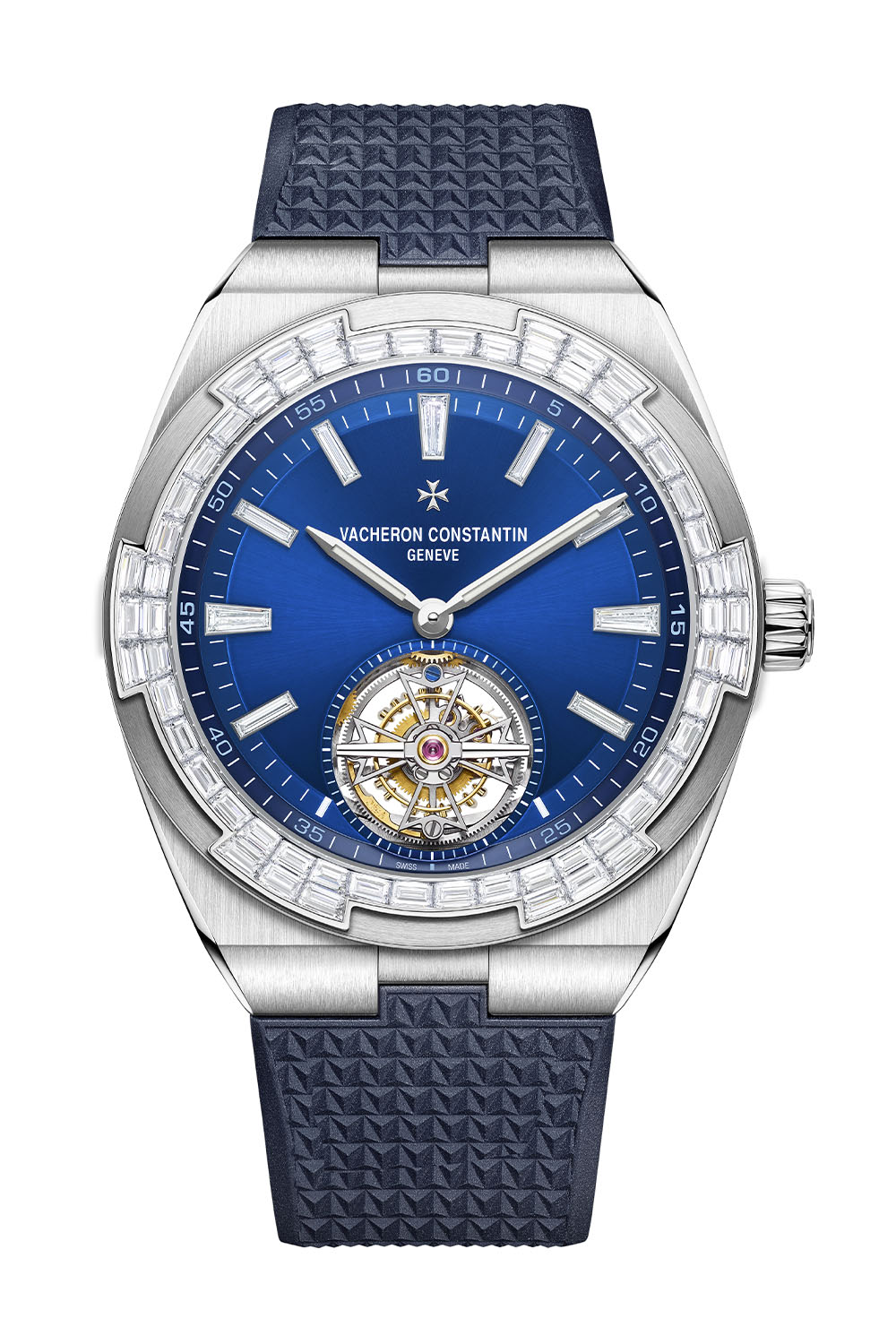 A blaze of baguette-cut diamonds and a white gold case magnify the luxury quotient of the sporty-chic Overseas Tourbillon.