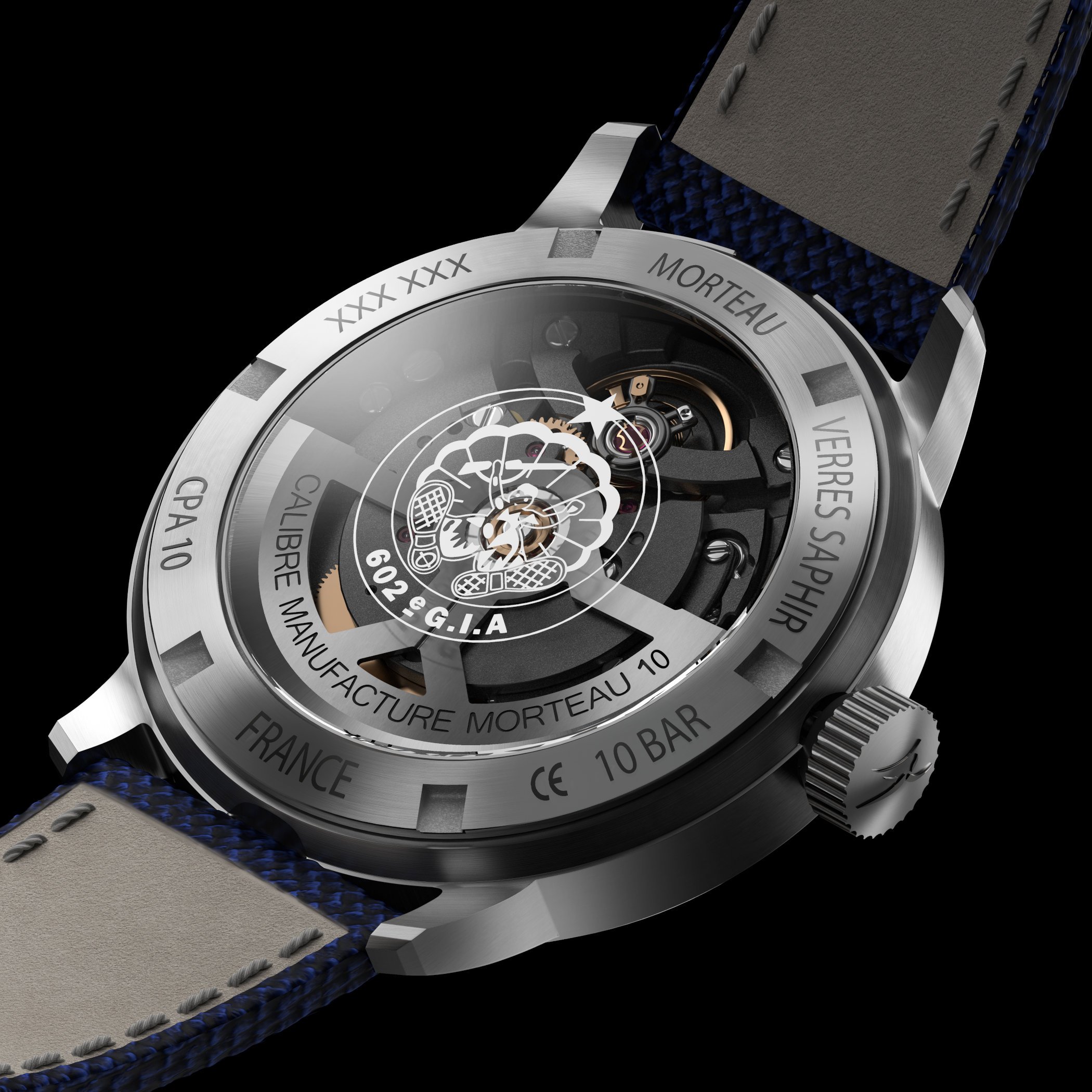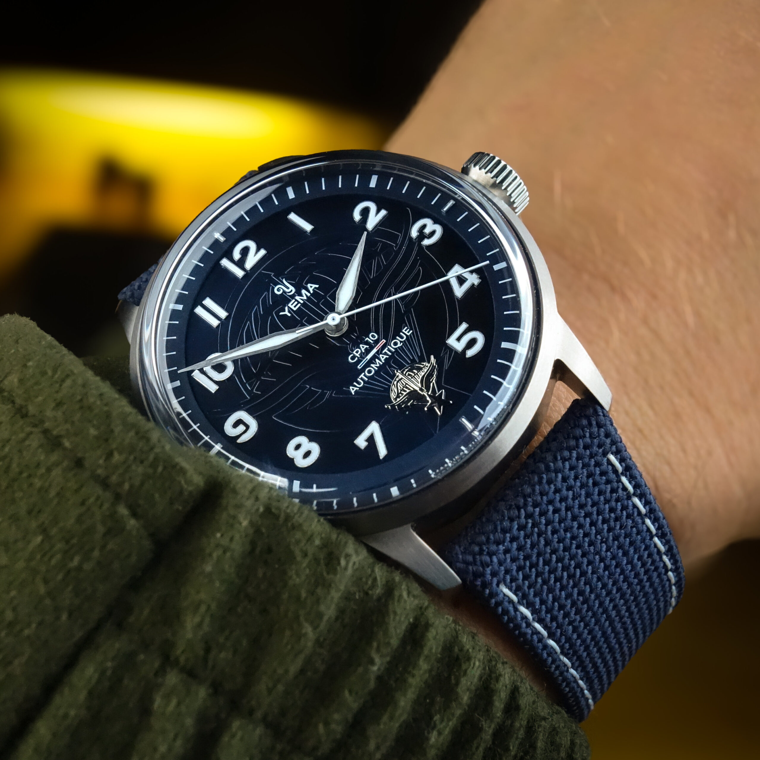Protected by a 2mm-thick double-domed sapphire crystal, the navy blue dial proudly flaunts Yema’s official FAF affiliations and is embossed with the silhouette of the CPA10 logo. It also features a silver appliqué at 6 o’clock with a winged parachute and a star surmounted by the colours of the French flag. As a Flieger-inspired watch, legibility is key, and the hour and minute hands and large Arabic numerals are printed in relief with a steel frame and treated with blue emission Super-LumiNova (blue emission). However, in honour of the parachutist commando’s number, the 10 o’clock marker is coated with white emission Super-LumiNova.