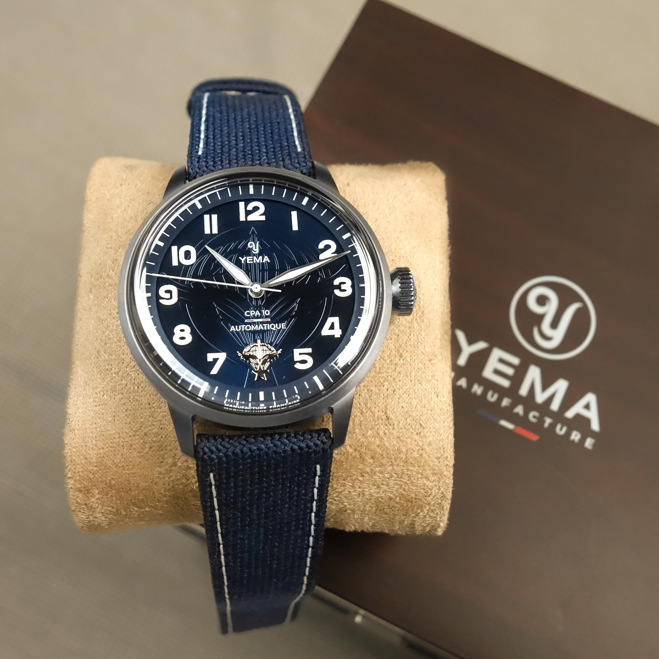 The watch is paired with a navy blue canvas strap with white stitching and a brushed titanium pin buckle. The watch retails for EUR 1,690. More information at yema.com.