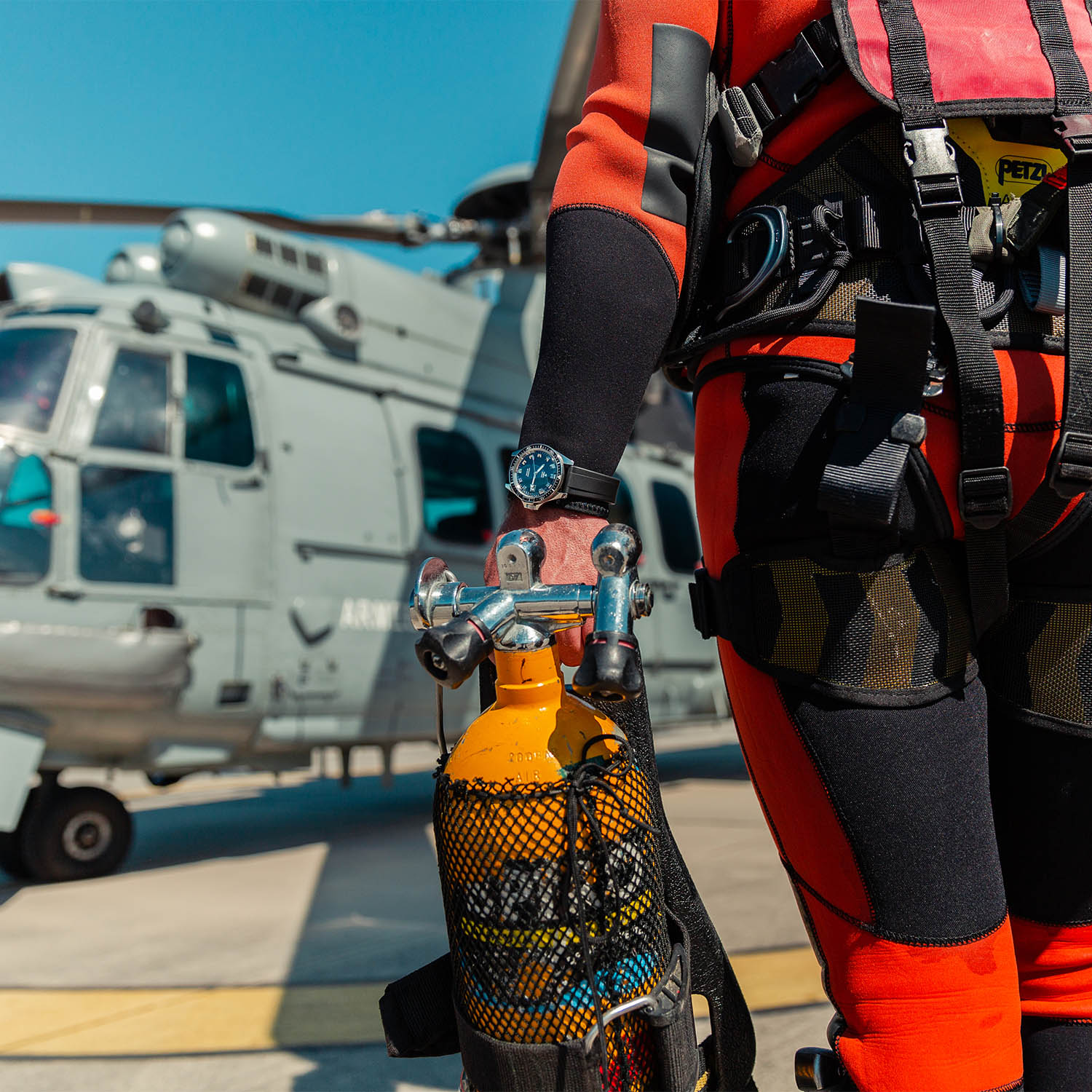 This watch, issued to the Search and Rescue team, actually marked the first collaboration between French manufacturer Yema and a military force, namely the French Air Force. Onboard their Caracal and Puma helicopters, the so-called “Ploufs” (the nickname of the French Sauveteurs-Plongeurs or rescue divers) carry several missions, the first one being to rescue Air Force pilots after a crash above the sea, a sort of last resort for aviators when other solutions are not available anymore. Acting in hostile environments, and operating both in the air and underwater, they thus needed a reliable watch to withstand most conditions.