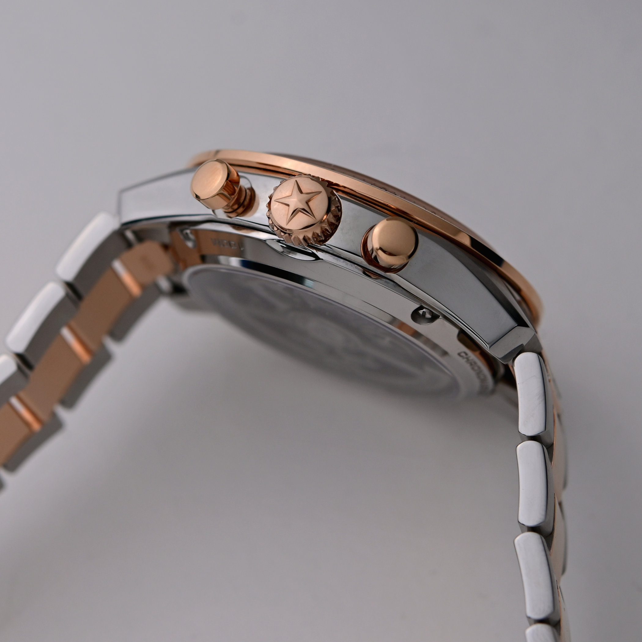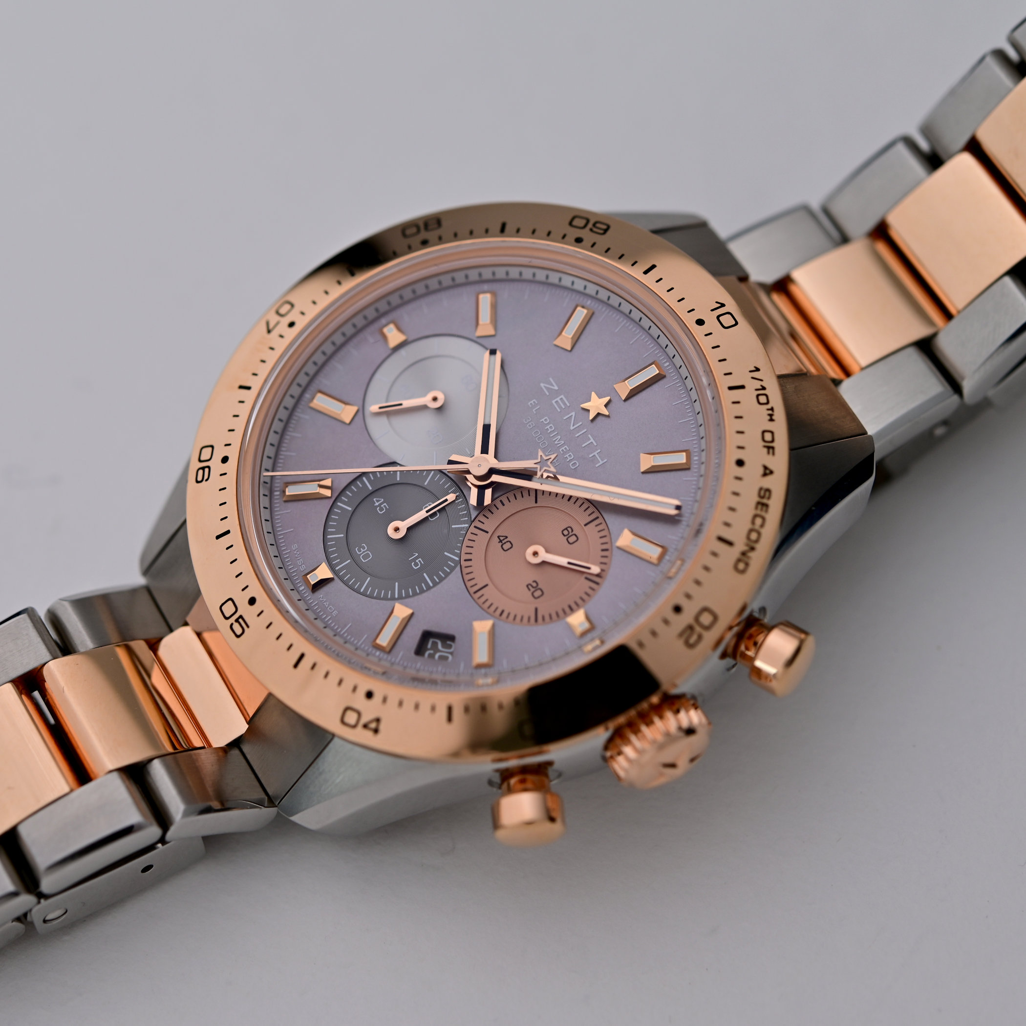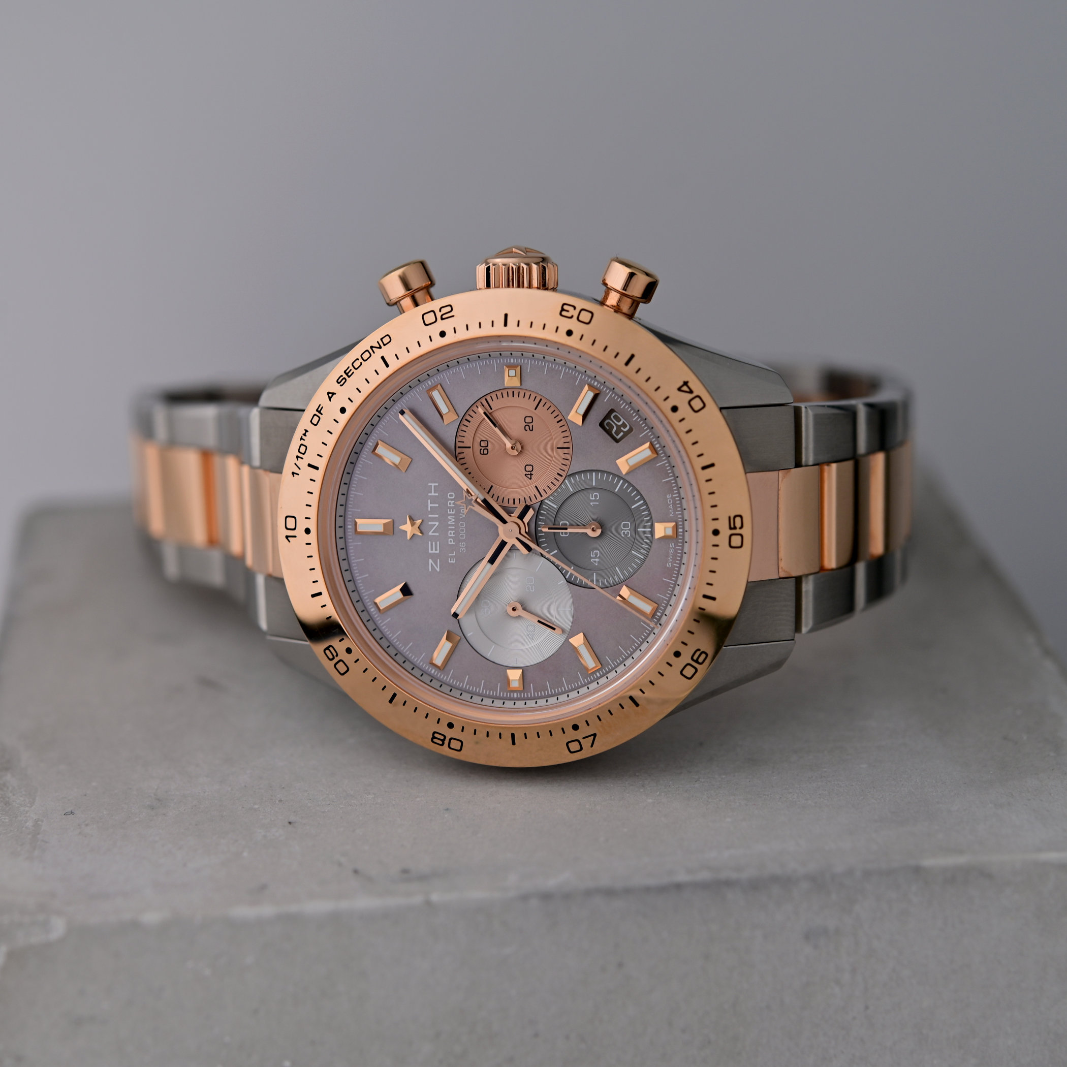Measuring 41mm, the case combines stainless steel with 18-carat rose gold for the bezel, crown, and pushers, bringing a warmer, dressier tone to the watch. Zenith sticks with the same case shape and the mix of brushed and polished surfaces you expect from this chronograph series. The signature overlapping counters at 3, 6, and 9 o’clock retain their usual place, joined by faceted hands and applied indexes set against the mother-of-pearl dial. Gold-plated hands and hour markers are coated with Super-LumiNova, and the date window appears at 4:30 as on other Chronomaster Sport models. The watch is also water-resistant up to 100 metres.