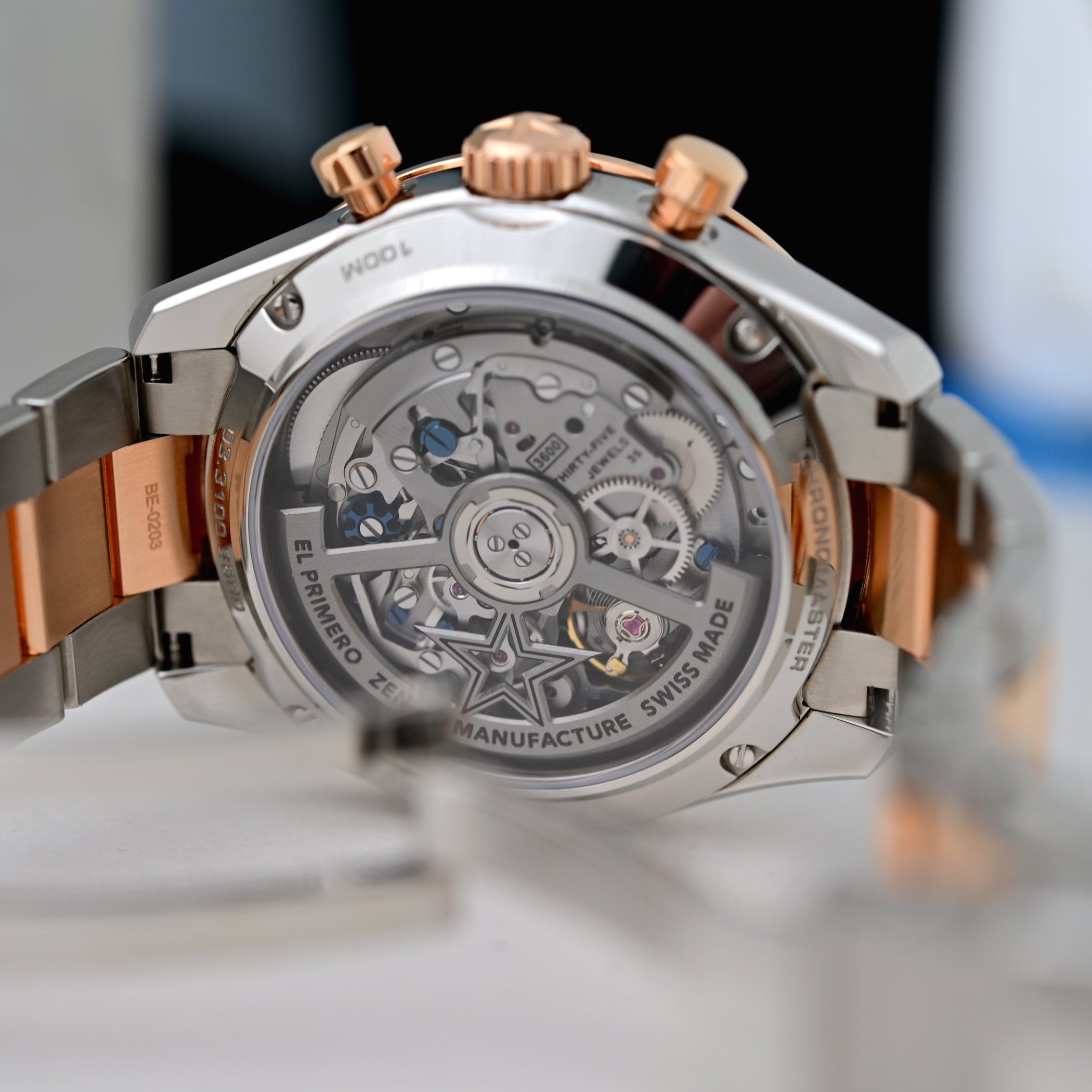 Powering the latest chronograph is the El Primero 3600 calibre, revealed through a sapphire caseback. This self-winding, high-frequency movement operates at 5Hz, allowing the central chronograph hand to complete one full rotation every 10 seconds and measure elapsed time to 1/10th of a second. The movement uses a column-wheel chronograph architecture and offers a power reserve of around 60 hours. Zenith finishes it with an openworked rotor shaped around the brand’s star emblem, visible through the transparent caseback.