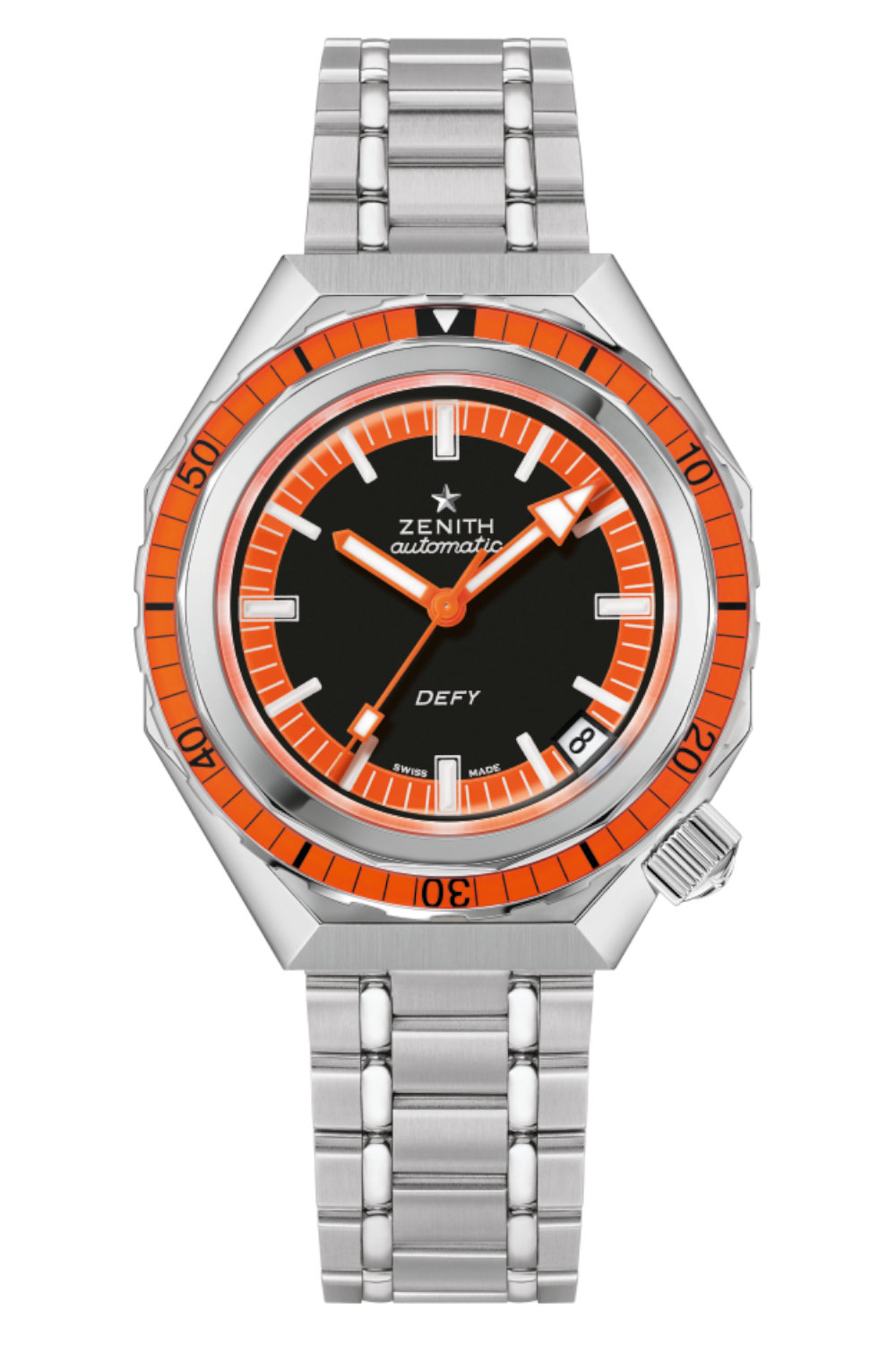 The angular octagonal base is identical to the original, with its wide, vertically brushed bevel and polished surface surmounted by the distinctive 14-sided bezel positioned above the bright orange rotating bezel. Faithful to the 600m water-resistant rating of the original, the screw-down crown is positioned at 4 o’clock, and the caseback is fitted with a sapphire crystal. The 600m depth rating was no mean feat back in the late 1960s and has become a symbolic number at Zenith since 600m is equal to 1,969 feet, the year the Defy A3648 was launched.
