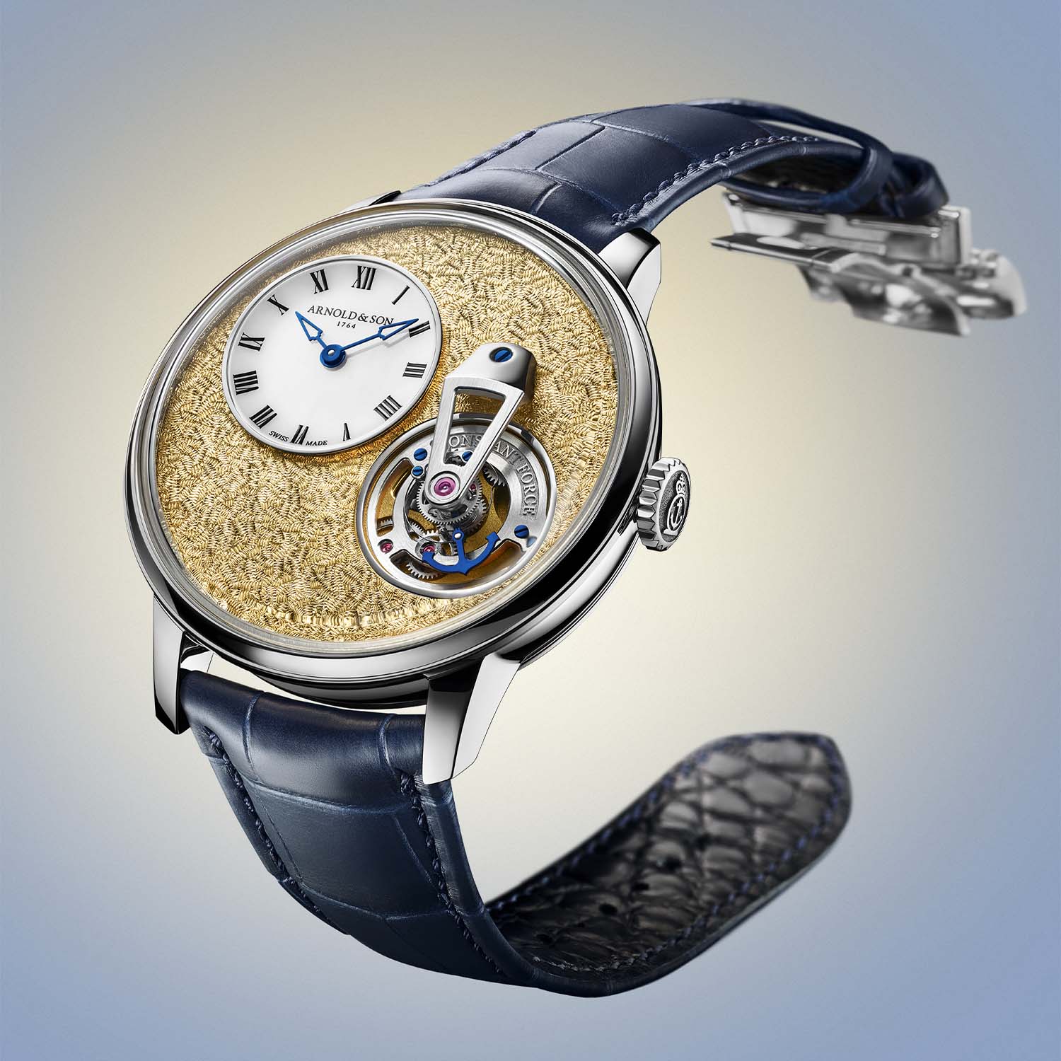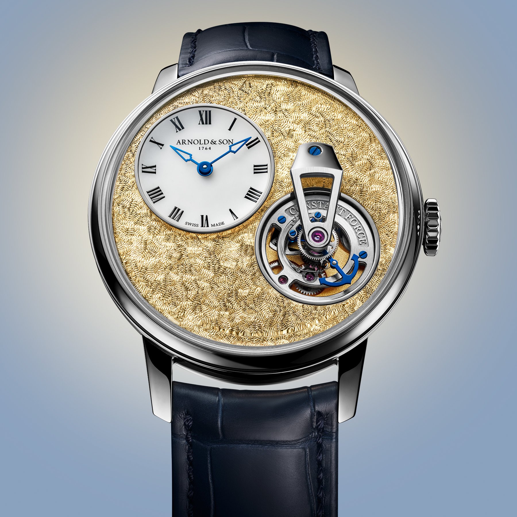 Similar to its predecessor, time is read on a concave white ppal subdial in the top left corner, with black Roman numerals and flame-blued hands for the hours and minutes. But it’s what surrounds this subdial, and the constant force mechanism as well, which matters most. Stepping away from the serenity of the white Grand Feu enamel dial of the original, this Platinum Edition has a solid yellow gold base dial with a hand-engraved Arnold & Son “fern” pattern. It’s inspired by the fern-covered moors around Tintagel, Cornwall, the birthplace of John Arnold. The result is quite spectacular, as the irregular zig-zags of the craftsman throw around reflections in all sorts of ways.