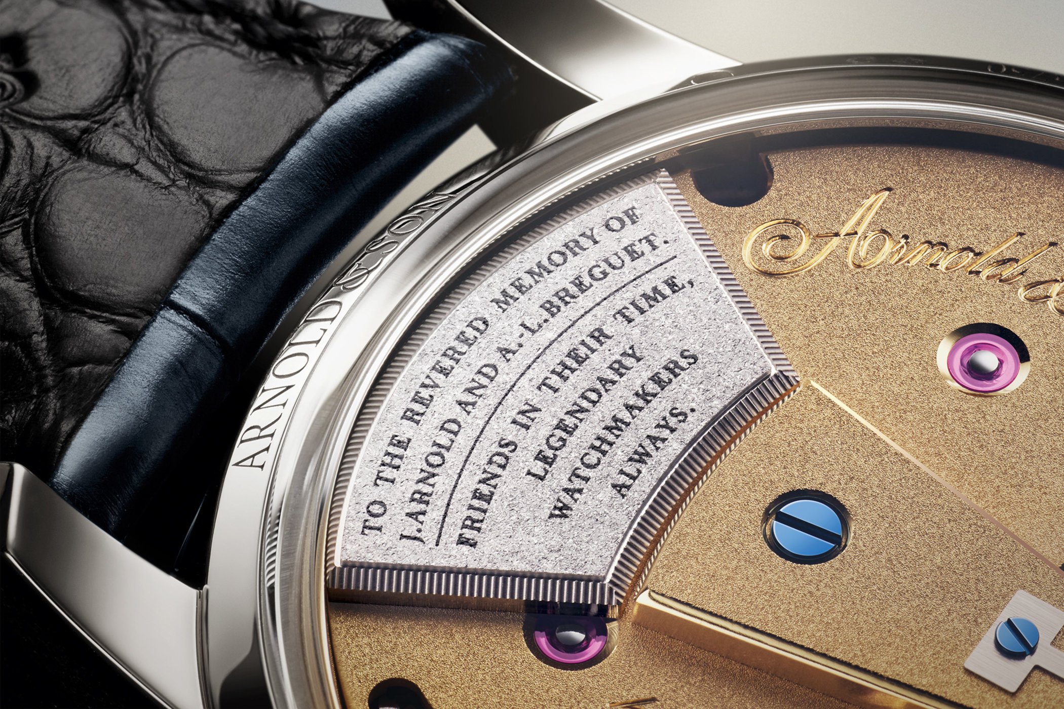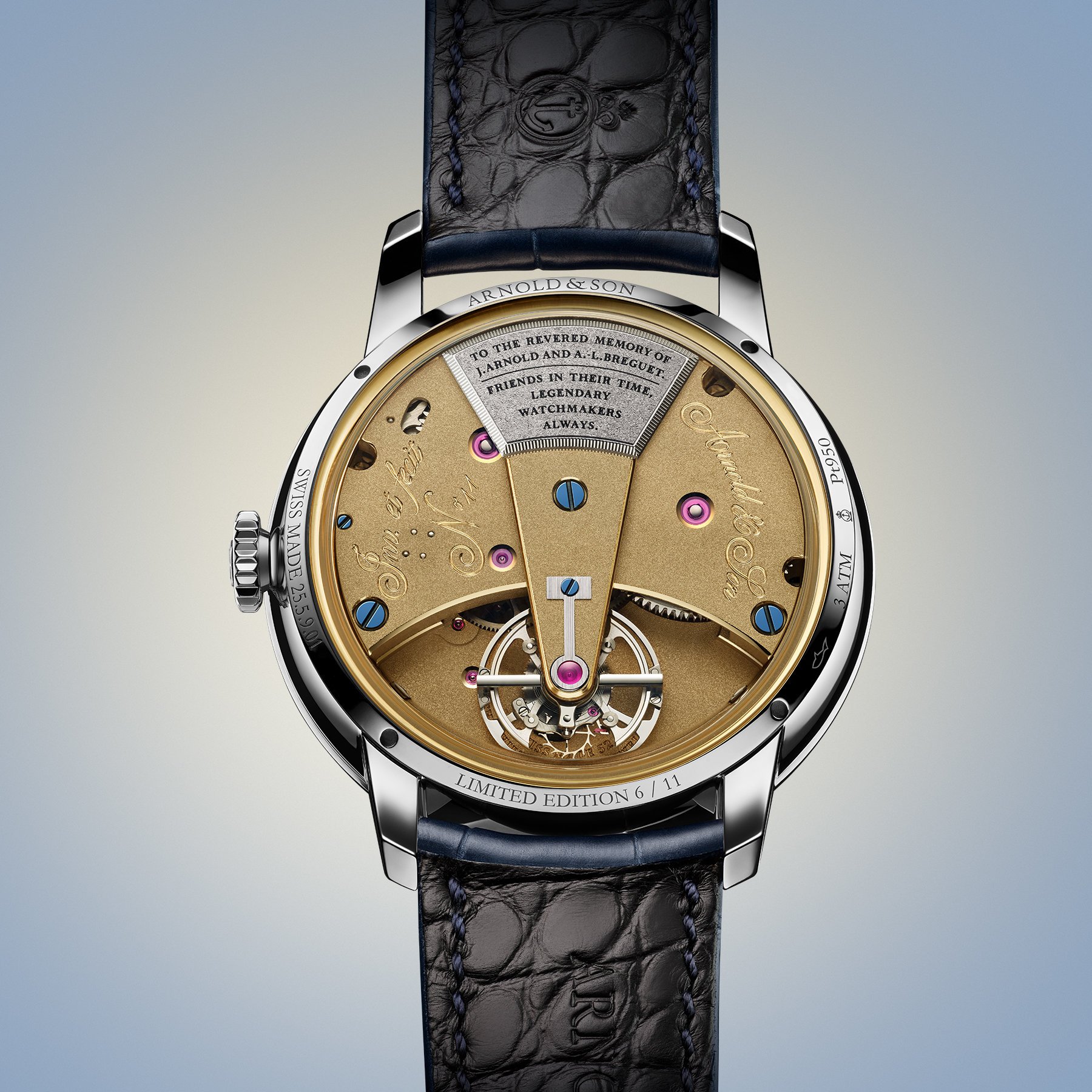 The AS5219 manually wound movement remains virtually untouched, apart from the finishing of some of the components visible dial-side. The constant force mechanism, evening out the energy delivered to the tourbillon escapement, is again presented in full view. The large, blued anchor-shaped deadbeat seconds hand is a classical styling cue found in many Arnold & Son watches, as well as the maker’s marine chronometry legacy, so it makes a fitting appearance. Around the back, you will see the same engraved plaque honouring the special friendship between John Arnold and Abraham-Louis Breguet at the top, with a large frosted and hand-bevelled bridge for the tourbillon escapement beneath it. It runs at a rate of 21,600vph and delivers a power reserve of 100 hours thanks to a twin-barrel system hidden by the three-quarter plate. The rest of the backside of the movement remains fairly restrained in design, although it is finished to Haute Horlogerie standards, of course.