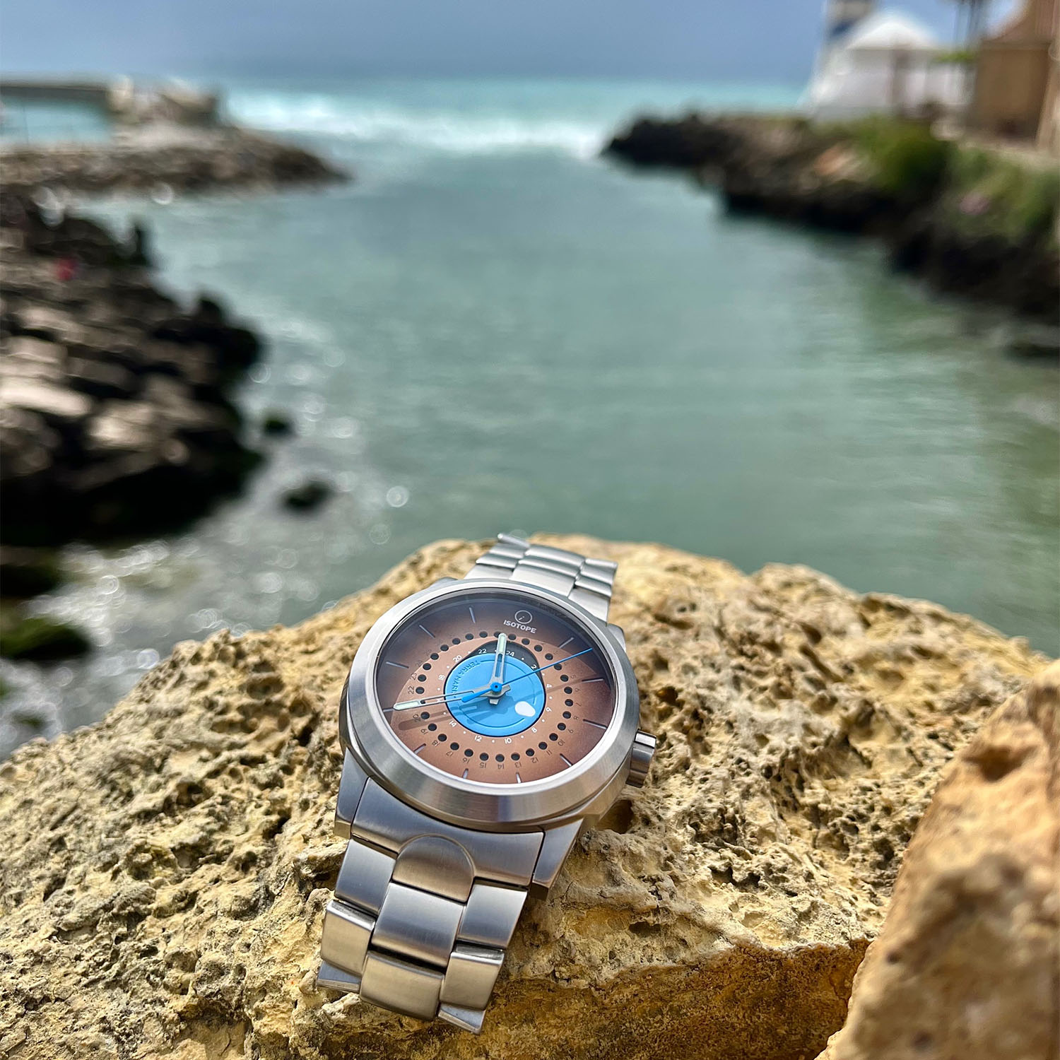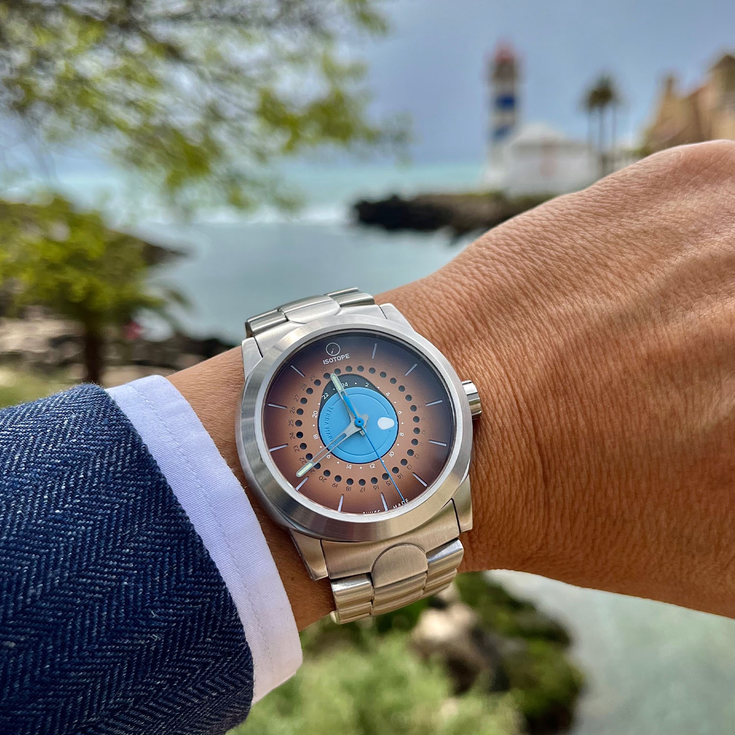 A microbrand with a relatively young history (founded 2016), UK-based Isotope Watches defines itself as “an independent, enthusiastic and driven brand (…) that combines original designs with traditional solutions and a boutique approach“. Something that could be said about countless young watchmaking companies, but looking at the offering of Isotope, you can see that the designs are truly original (in a good way). It’s not only about shapes and colours, but also some nice tricks for the display. One of the brand’s most standout models is, without a doubt, its traveller’s watch. And today, the Isotope GMT 0º becomes the “Terra Maris” Limited Edition, a watch with truly captivating colours, resulting from a collaboration with one of our good friends, the only journalist that talks both watches and tennis… Miguel Seabra, of course.
