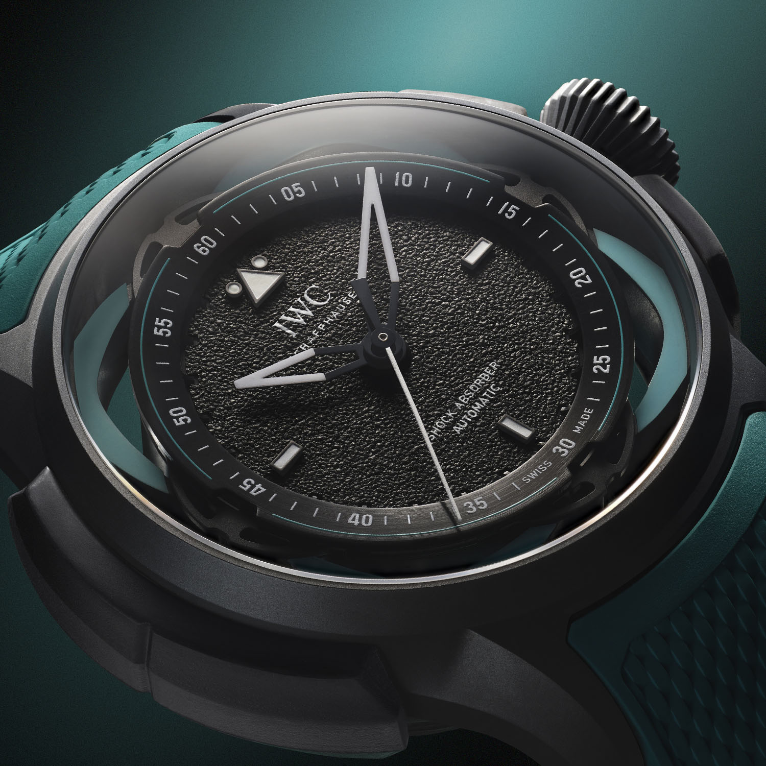 Also, the SPRIN-g PROTECT shock absorber system has been retained and the watch should be able to survive everything Toto might throw at it, including during some of his most temperamental moments. What has changed then with this new Big Pilot Shock Absorber XPL for Toto Wolff…? First and foremost, the black dial has been updated with a new stamped grained texture, with revised lumed applied markers, a floating-like inner flange and redesigned openworked lumed hands. Also, the BMG shock-absorbing spring has been coated with Petronas green Super-LumiNova.