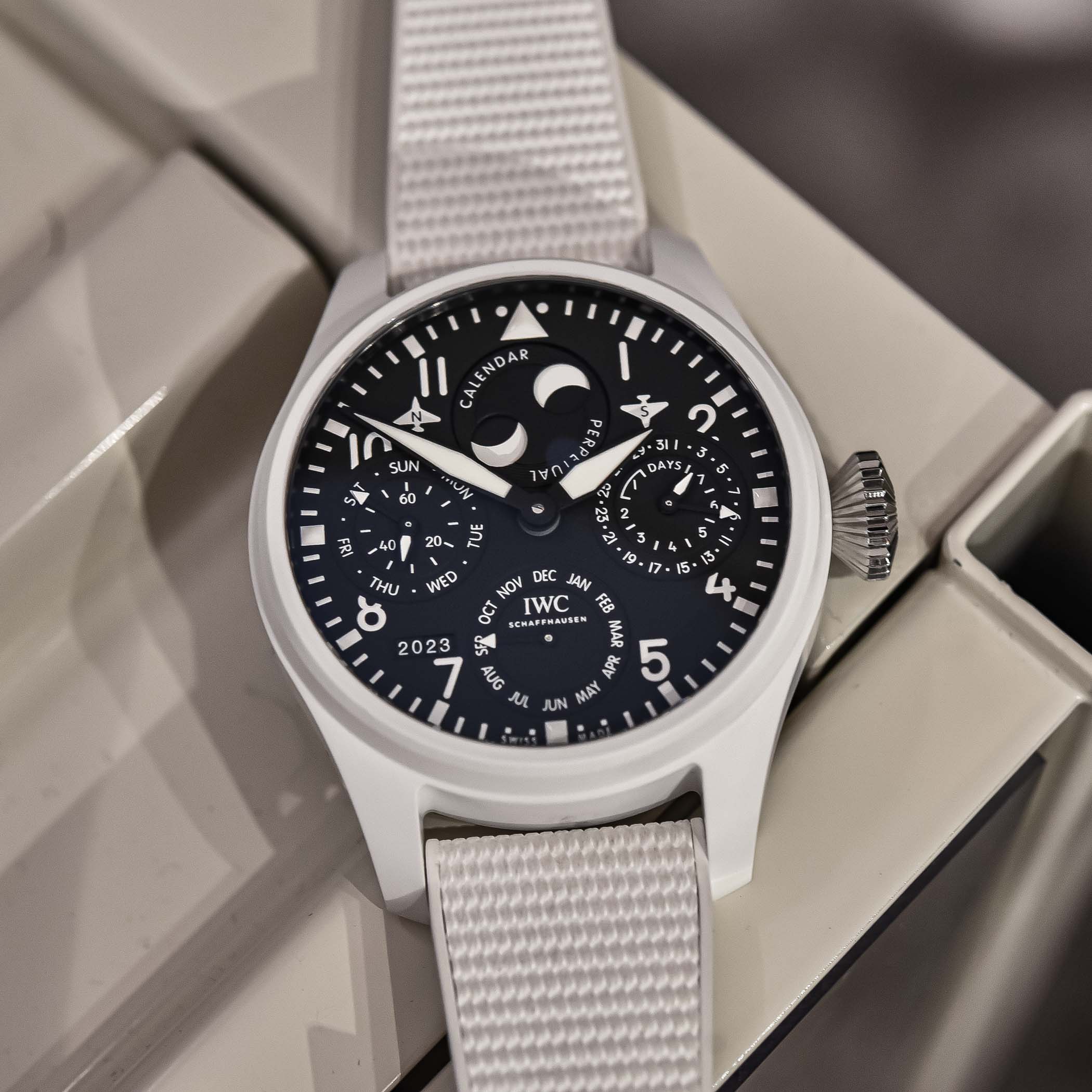The timepiece’s full title is Big Pilot’s Watch Perpetual Calendar TOP GUN Lake Tahoe. Lake Tahoe? Isn’t that a location where billionaires like Zuckerberg, Elliot, Duffield and Milken own insanely expensive properties? What’s the connection with Top Gun pilots, and why is the pilot’s watch white? Fortunately, this part is straightforward. The matte white colour of the ceramic case, specified as “IWC Lake Tahoe” by IWC and Pantone Color Institute, draws inspiration from the dress code of pilots operating from the nearby TOPGUN fighter school that frequently fly over Lake Tahoe and the winter landscape around the lake. In 2022, the brand introduced “The Colours of TOP GUN” collection, showcasing various hues – please watch this video where Christopher Grainger-Herr, CEO of IWC, elaborates on the aviation colours and the use of coloured ceramic by the brand (Woodland Green, Mojave beige, Oceana Blue and, of course, black).