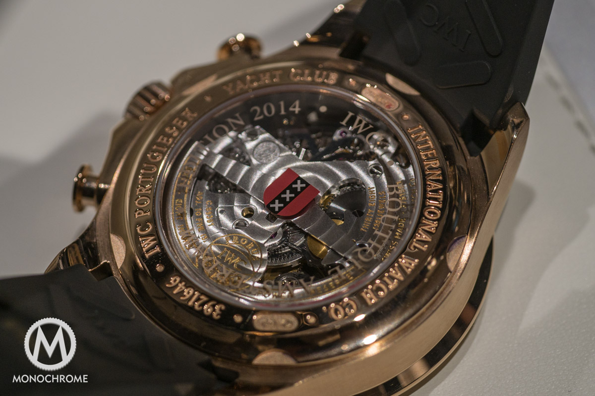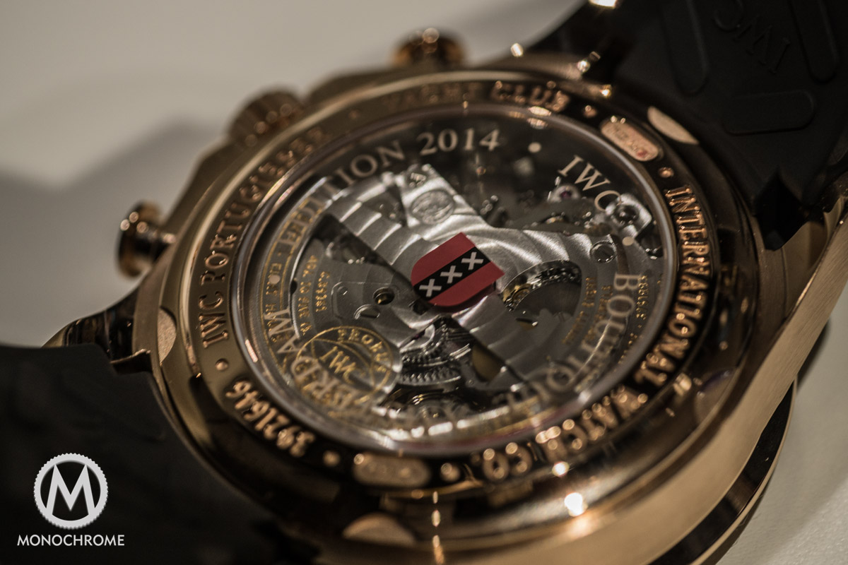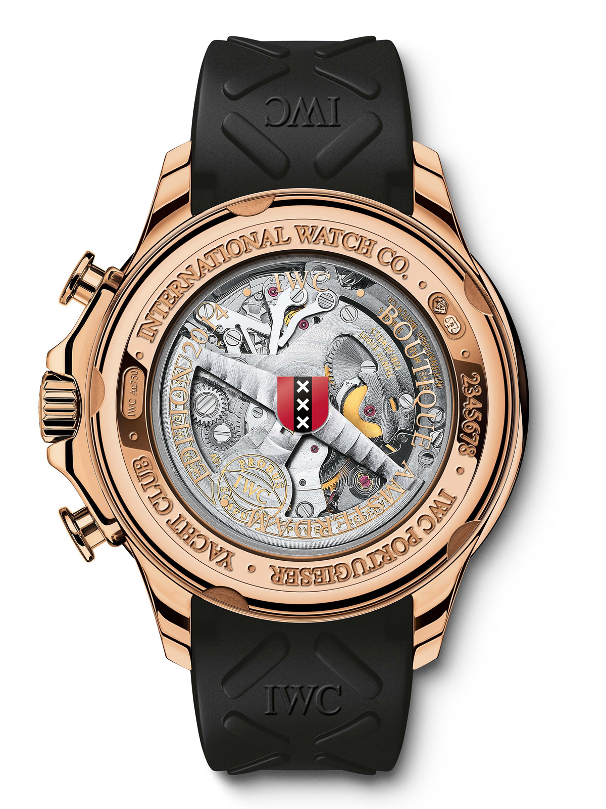 To celebrate the boutique’s opening, there’s a limited edition Portuguese Yacht Club “Amsterdam 2014” (Ref. IW390209) that is limited to five pieces. The Portuguese Yacht Club, which we covered here, here and here, is a robust 45.4 mm large red gold watch that comes on a rubber strap with (red gold) folding clasp. It features a chronograph movement, IWC’s in-house calibre 89360, that is visible through a sapphire crystal case back that bears the coat of arms of the city of Amsterdam.