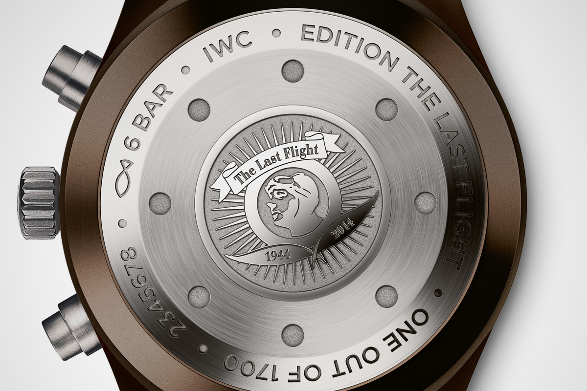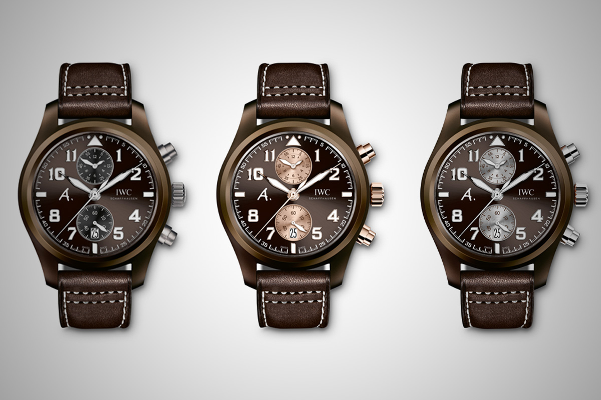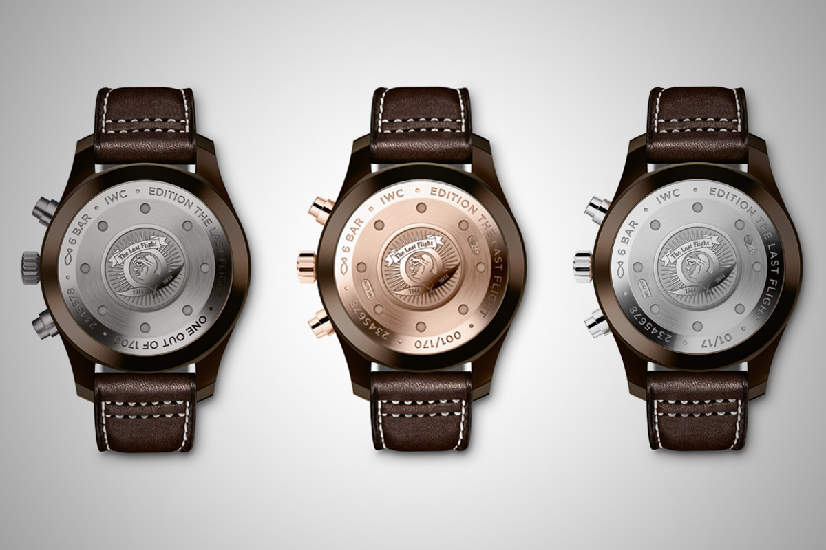 This new ‘The Last Flight’ limited edition of the IWC Pilot Chronograph is in reality a collection of 3 watches, using different metals for the crown, pushers, caseback and sub-dials to create contrasting accents:
