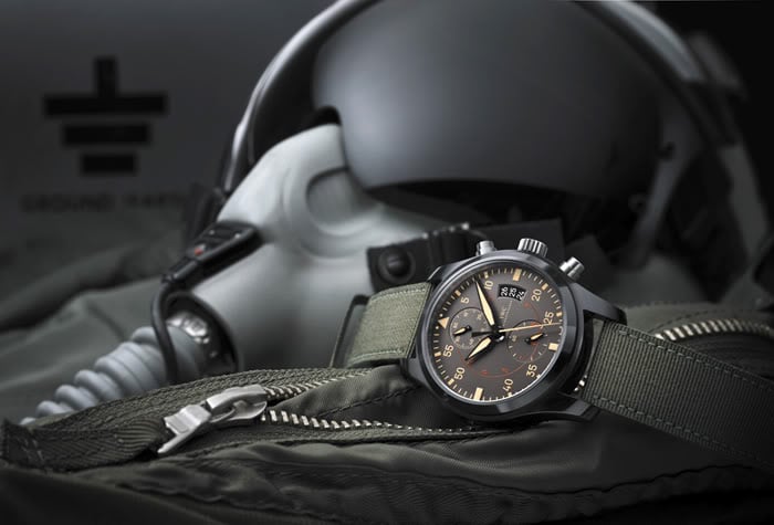 The case is slightly larger than the aforementioned Spitfire model (41mm vs 39mm) with a thicker height (11.4mm vs 10.8mm), but the design of the TOP GUN automatic is more in line with the IWC Big Pilot’s watch than the vintage-inspired Spitfire. The case comes only in matte black ceramic, while the Spitfire three-hand automatics have stainless steel and bronze variants. A second model, the Double Chronograph TOP GUN Ceratanium, is a split-seconds chronograph version for those looking for something more complex.