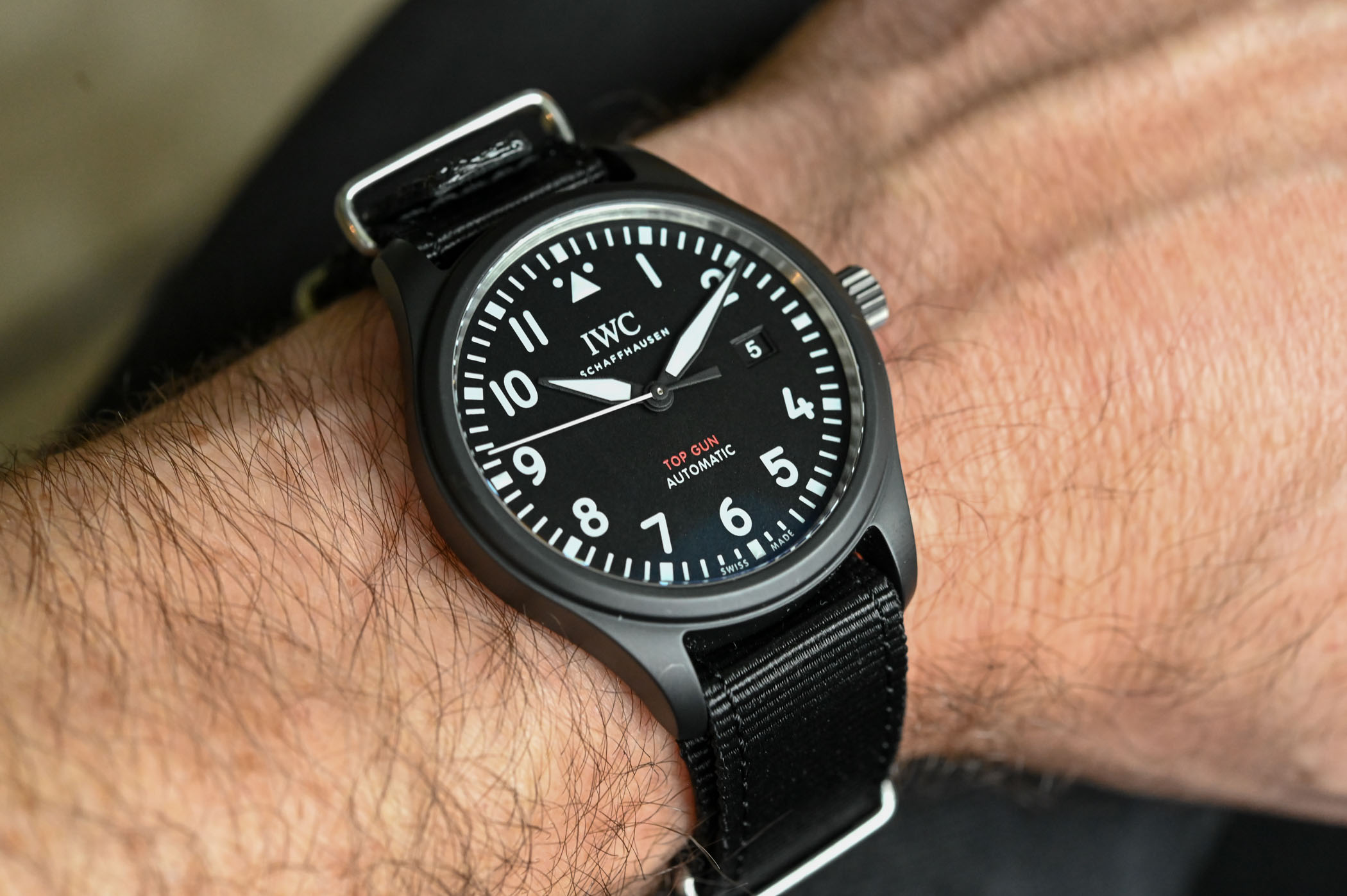Looking closer at the dial, it has a simple pilot’s watch aesthetic that’s common throughout many of IWC’s Pilot’s Watch lines. Large white Arabic numerals surround the perimeter with a minute track spanning the dial’s edge (with five-minute marks). A bevelled date window sits at 3 o’clock with white numerals on a matching black background. It’s simple, clean and highly legible, which is what a pilot needs in the hyper-fast environment of a fighter’s cockpit. The hands are black with plenty of white luminescence and have the same propeller shape as previous Pilot’s models.