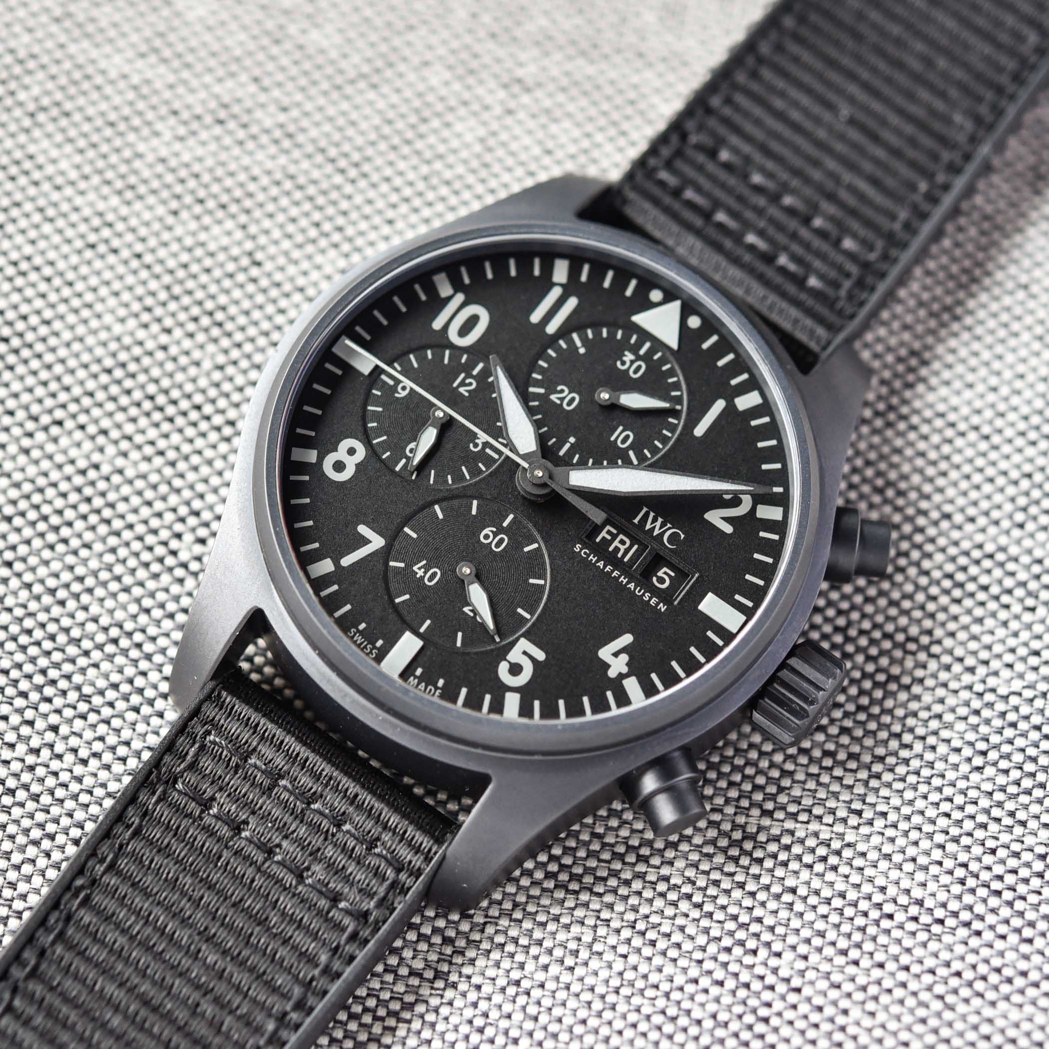 The dial of this Pilot’s Watch Chronograph 41 TOP GUN Ceratanium follows the same design codes as the Doppel version, with a matte black (slightly grained) background. The hands are also black and all the tracks, numerals, logos and markers are done in mid-grey, bringing a stealthy look but still with enough contrast. Luminous material is found on the hands and the 15-minute markers. Complementing the dark look is a Black rubber strap with black textile inlay and a Ceratanium pin buckle.