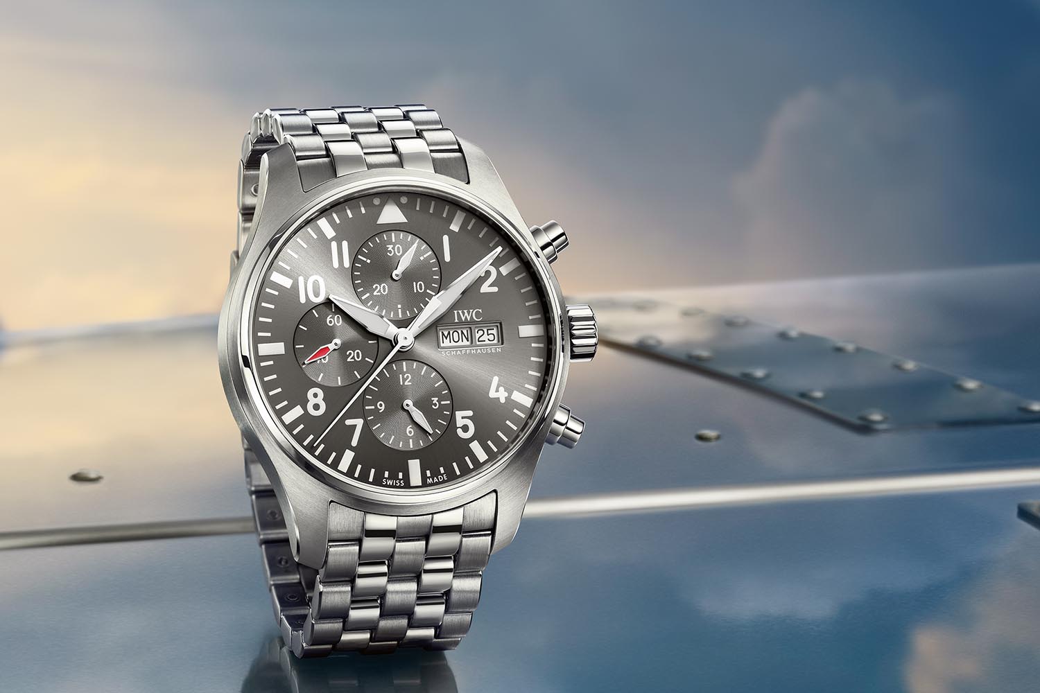 The third model in the IWC Pilot’s Watch Chronograph line-up is the Spitfire IW377719. With its recognizable slate grey sunburst dial, IWC has been offering the Spitfire since 2006, and always with a dial chosen to match the color of the eponymous aircraft. Various polished surfaces, for the bezel and the bracelet-links, make it stand out a bit more from the other IWC Pilot’s Watch Chronograph novelties. Additional two-tone NATO straps are also new for the Spitfire.