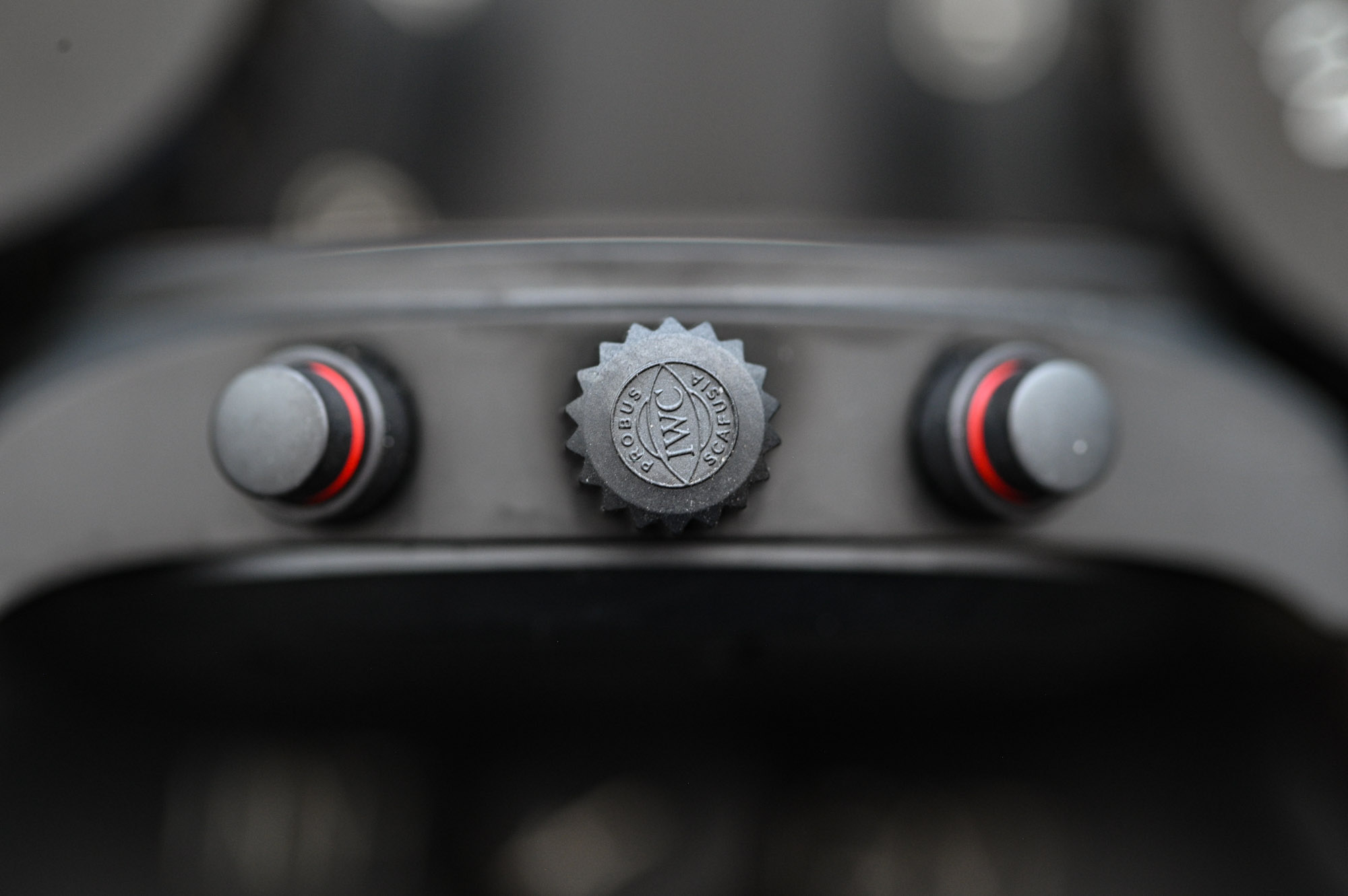 Underneath a convex, scratch-resistant sapphire crystal glass with layers of anti-reflective coating applied to both sides, is a black dial with matching black hands to achieve the watch’s tactical look. The jet counterbalance design on the base of the TOP GUN’s central seconds hand is finished in red. In former models like the Pilot’s Watch Chronograph TOP GUN and Pilot’s Watch Automatic TOP GUN, flashes of red have been used to underscore the “TOP GUN” lettering and the 60-seconds sub-counter hand. For the “SFTI” edition, IWC has balanced the chronograph dials at 12, 6 and 9 o’clock with a day and date feature at the third hour. Luminous central hands and Arabic numerals around the periphery of the dial have been treated with luminescence to assist with timekeeping during night flights or in low-light conditions.