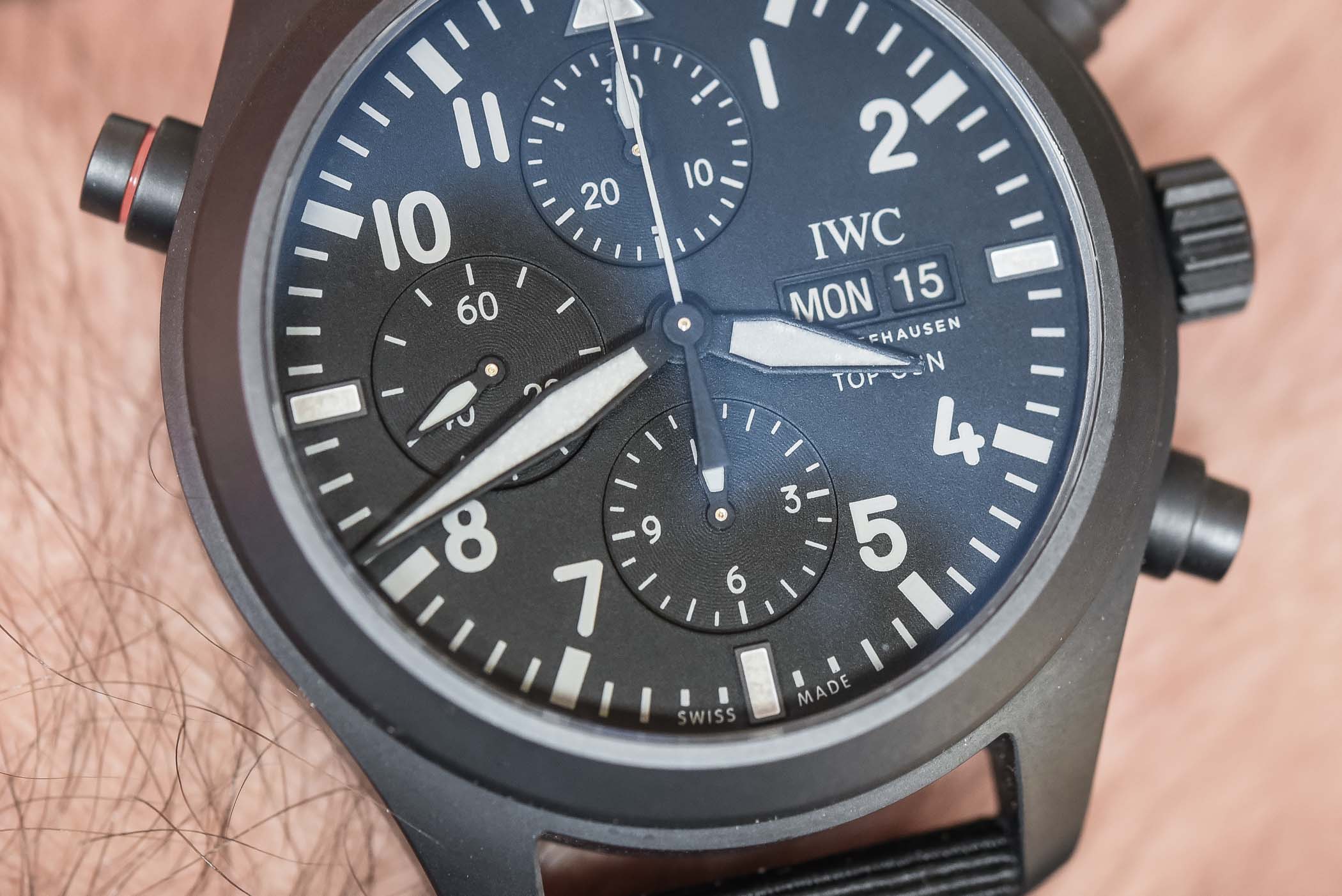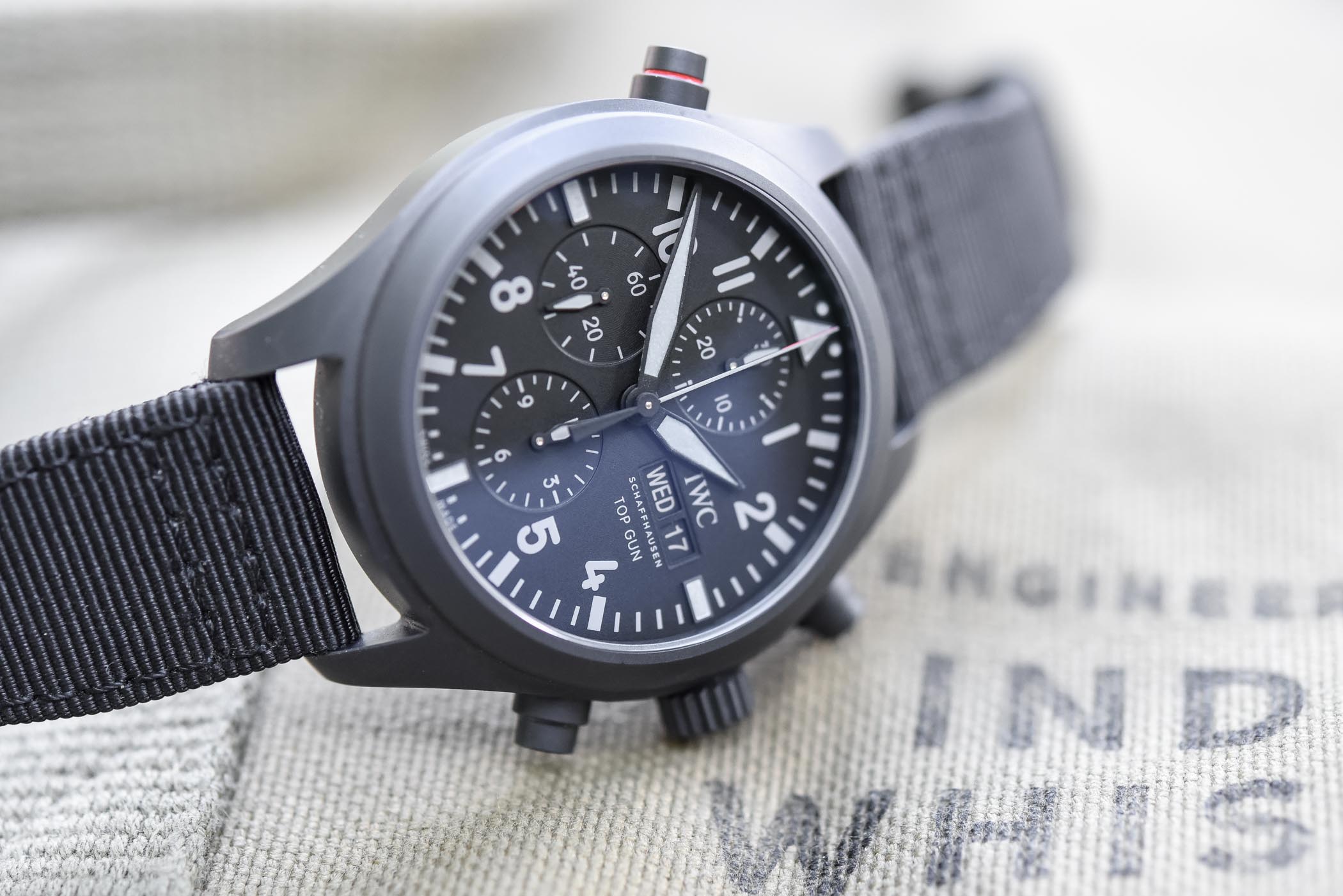 From a wearer’s perspective, the IWC Pilot’s Watch Double Chronograph TOP GUN Ceratanium benefits from this new material that results in a watch that is light despite its size, and thus comfortable – as long as you have a relatively large wrist. it does wear smaller than its specifications indicate. Ceratanium is also soft to the skin and not as cold as steel, for instance. The watch has a strong sporty, tool-like feeling and won’t be your best ally with a suit – but all in all, this isn’t its vocation. It is worn on a textile strap, which befits the overall instrument concept.