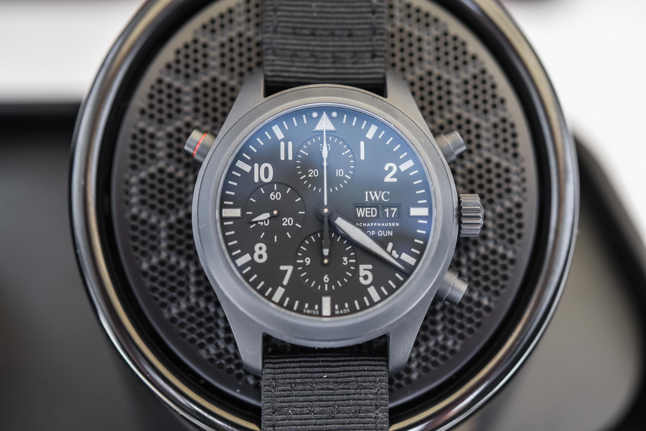 Under the closed Ceratanium caseback with the TOP GUN emblem is the calibre 79420, a movement used by IWC for over 25 years based on Habring’s research. This split-seconds chronograph is based on a Valjoux 7750 architecture, extensively modified with the addition of the rattrapante module, which is done in Schaffhausen. It retains most of the 7750 specifications, including its 44-hour power reserve, its typical wobbly rotor, the day-date function and the cam-operated chronograph function. This movement might not have the noblesse of a Patek split-seconds calibre, but in this context, that’s not what we’re asking for. This movement is not only extremely robust and simple but is also one of the most accessible split-seconds chronograph movements available.