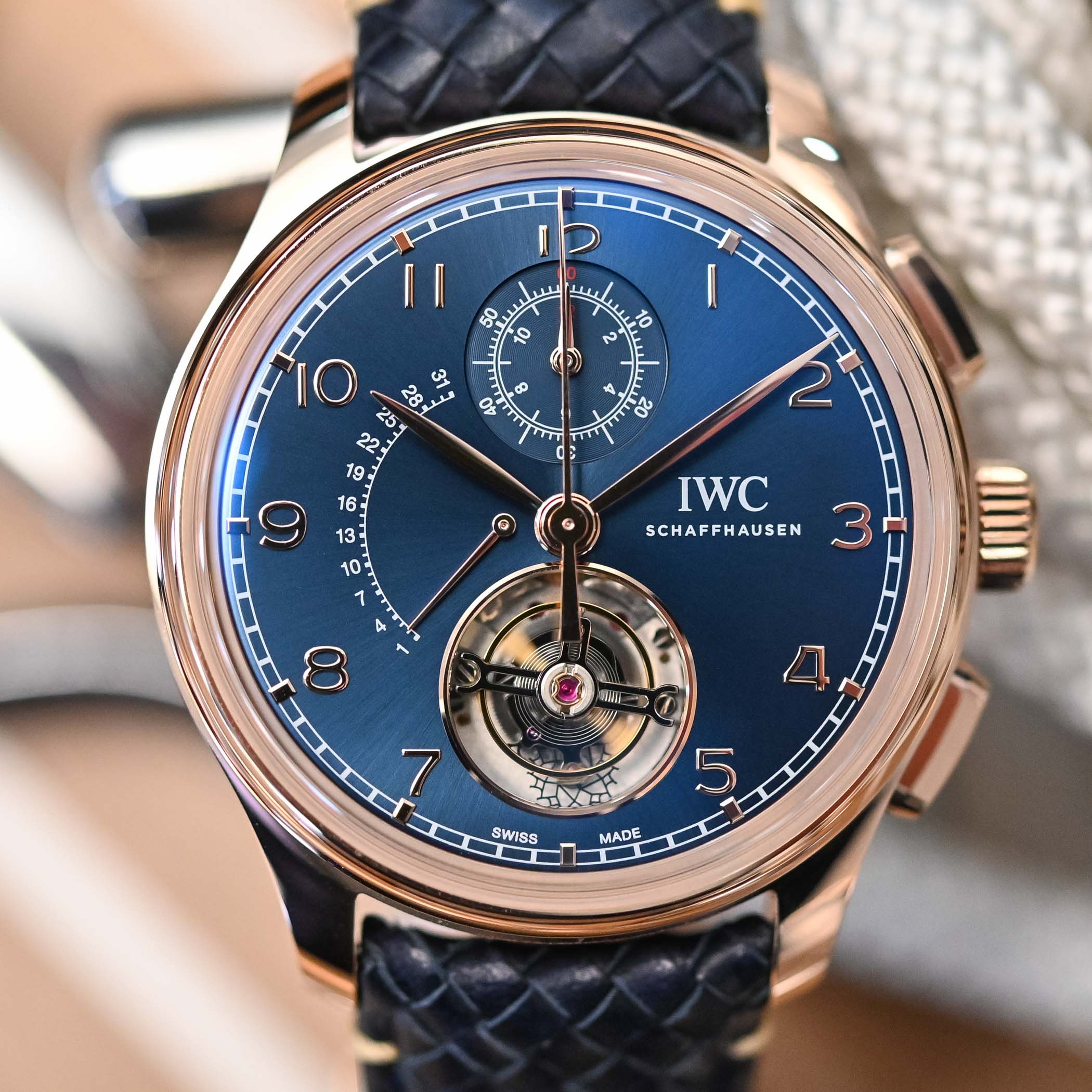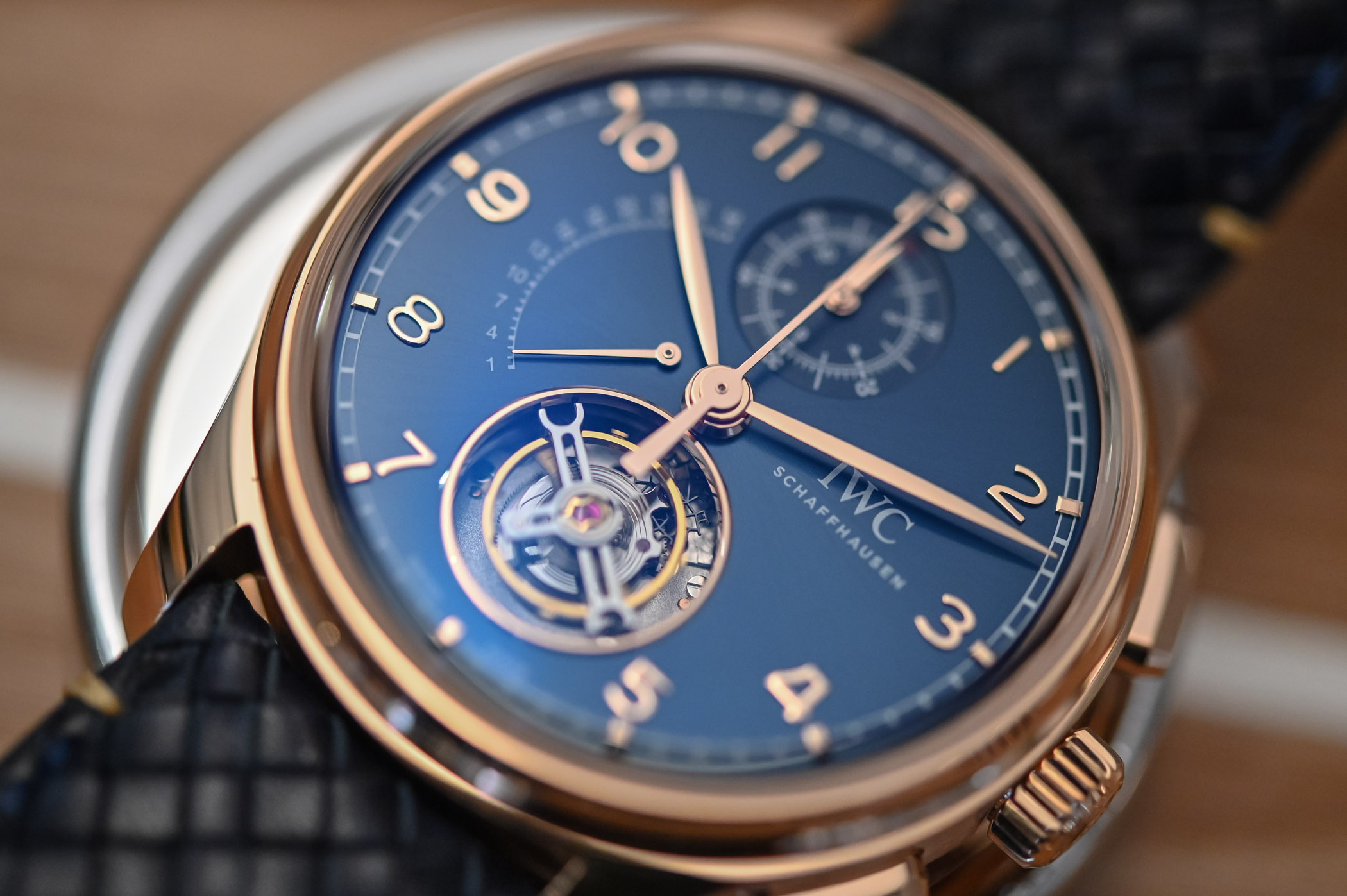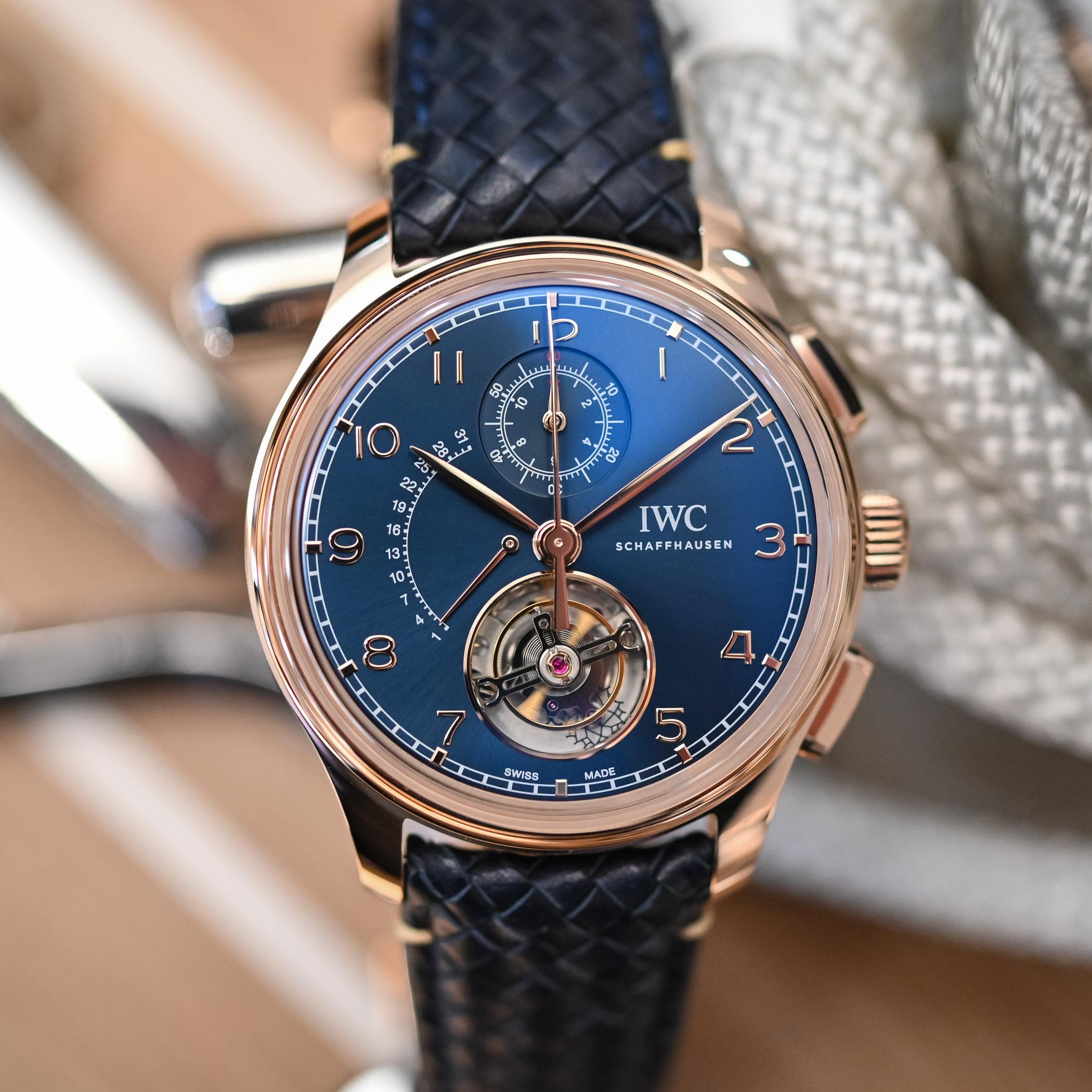During the 2020 online edition of Watches & Wonders, IWC unveiled this complicated Portugieser flying tourbillon, retrograde date and flyback chronograph model. Marking the top-end releases in the new Portugieser collection, along with an equally impressive Portugieser Perpetual Calendar Tourbillon, the tourbillon chronograph watch was presented in precious metal cases of gold or platinum. If you think this combination of complications already existed, you’d be right since they made their debut in the IWC Da Vinci Tourbillon Rétrograde Chronograph of 2017 and later that year in the one-off Portugieser Tourbillon Rétrograde Chronograph for Laureus Charity Night 2017. The gold model with blue dial ref. IW394005, which is also a Boutique Edition, was our candidate for today’s hands-on session. Boutique editions refer to IWC models that combine gold cases and blue dials, very fitting given the maritime theme of the Portugieser.