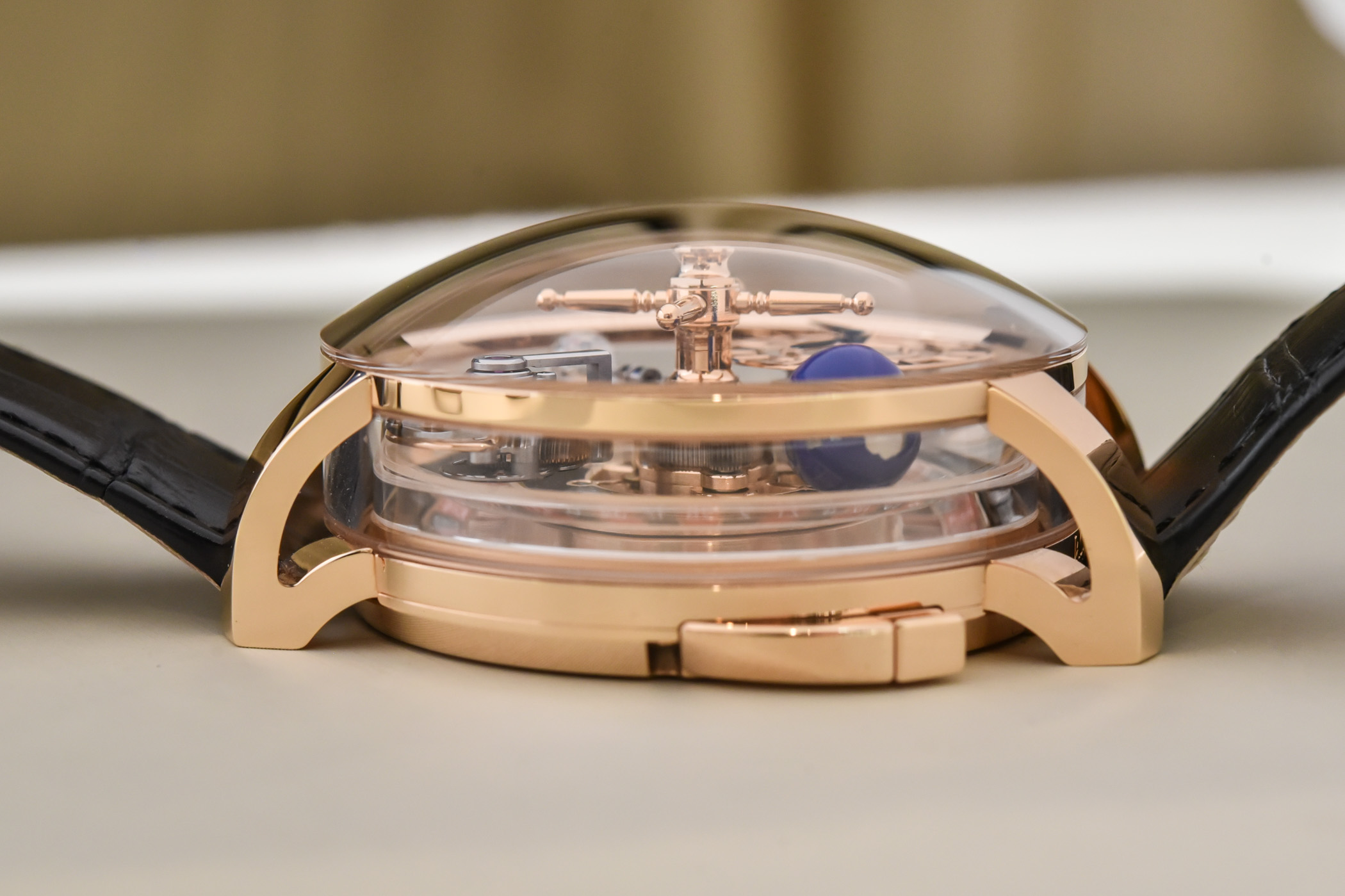 Like all Astronomia watches, turning the watch over reveals two symmetrical flip-up keys that sit flush with the pink gold caseback. One is used to wind the movement and the other to set the time. Last, the watch is worn on an alligator strap secured to the wrist with an 18k pink gold folding buckle.