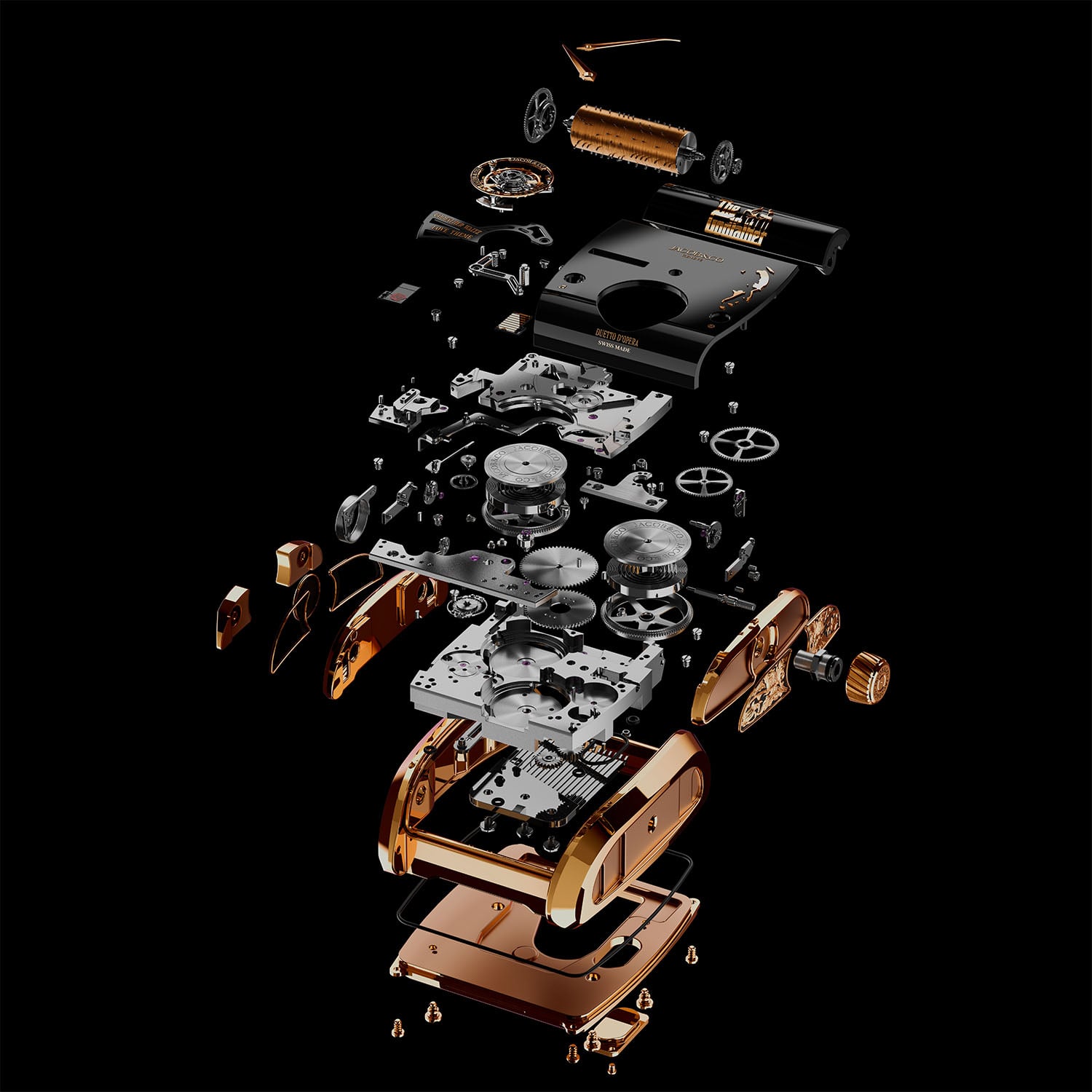 The crown features spiral grooves inspired by a gun barrel, the case band is richly engraved with Don Corleone’s rose motif. Under the curved, dome sapphire crystal, the ink-black lacquer dial is emblazoned with a portrait of Marlon Brando as Don Corleone as well as the movie’s signature puppet strings. The back of the watch is engraved with bullet holes and features a piano-shaped sapphire opening that allows you to discover the music box comb inside as well as a plate engraved with The Godfather Love Theme’s actual score.