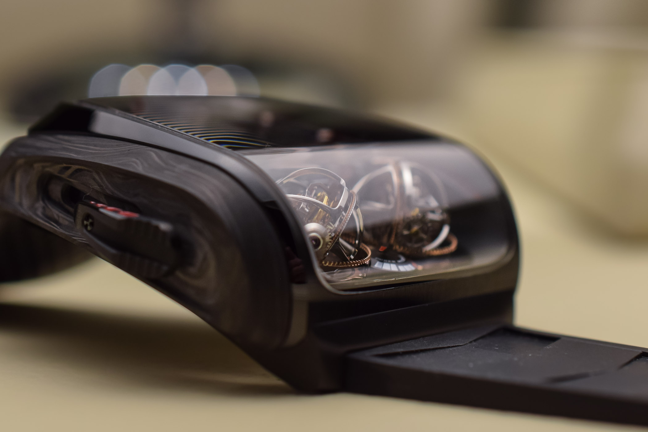 The Twin Turbo Furious features a decimal repeater. It chimes the time down to the minute in a more intuitive way than the traditional minute repeaters: rather than chiming hours, quarters and minutes, it chimes hours, ten-minute intervals past the hour and minutes past the last ten-minute interval.