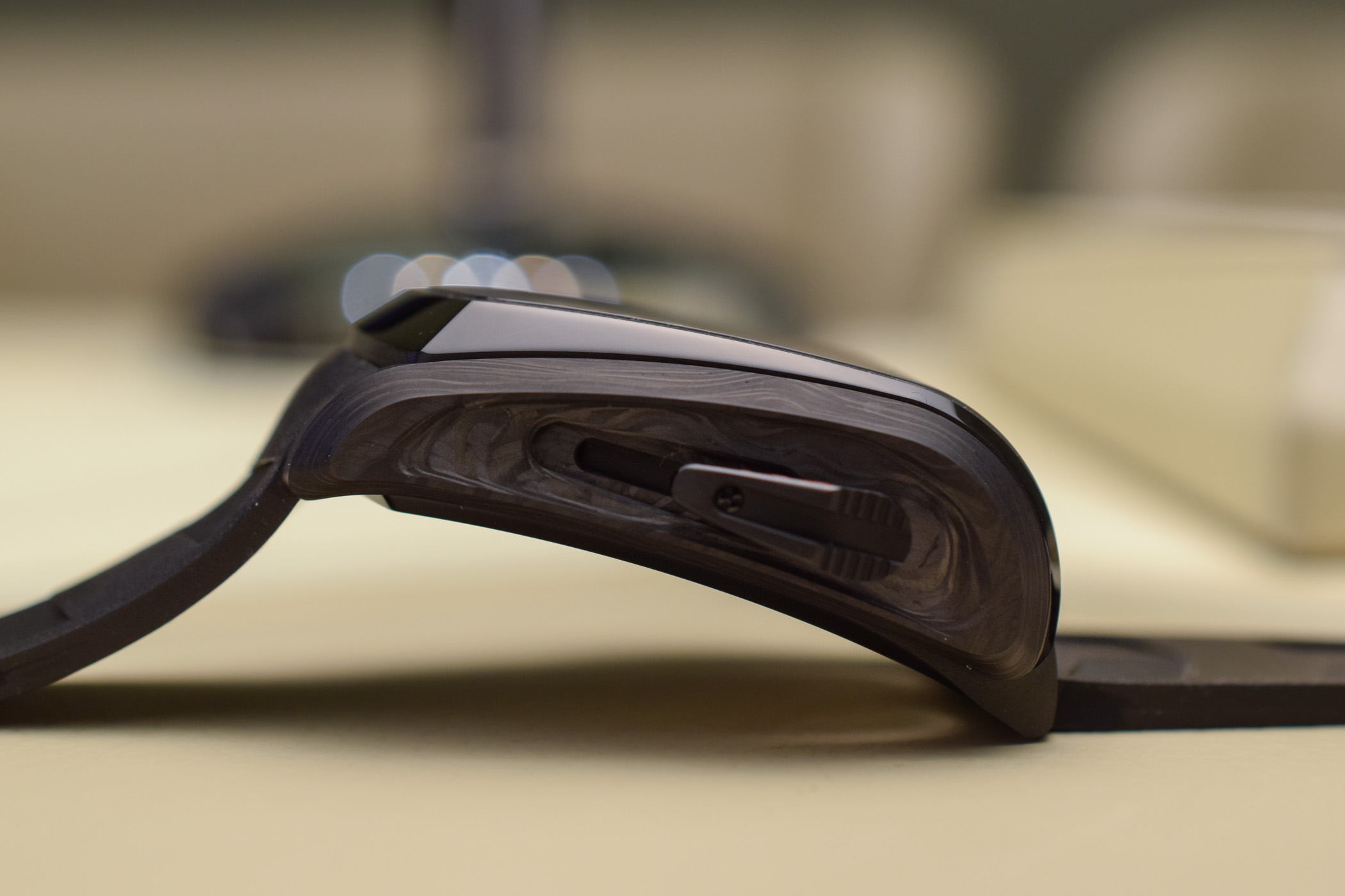 Cased in black DLC titanium and carbon fibre, the Twin Turbo Furious is a leviathan (57mm x 52mm). The complex case is made of 88 parts. The watch is wound up through the crank placed on the crown at 3 o’clock. The minute repeater slide is located at 9 o’clock. The dial is smoked sapphire crystal allowing a view of the movement’s intricacies. It features the “Jacob & Co.” logo and a red neoralithe inner ring with seconds graduation and indexes with luminescent material. Like it or not, it is hard to remain indifferent to the exuberant, extreme, demonstrative personality of this watch.