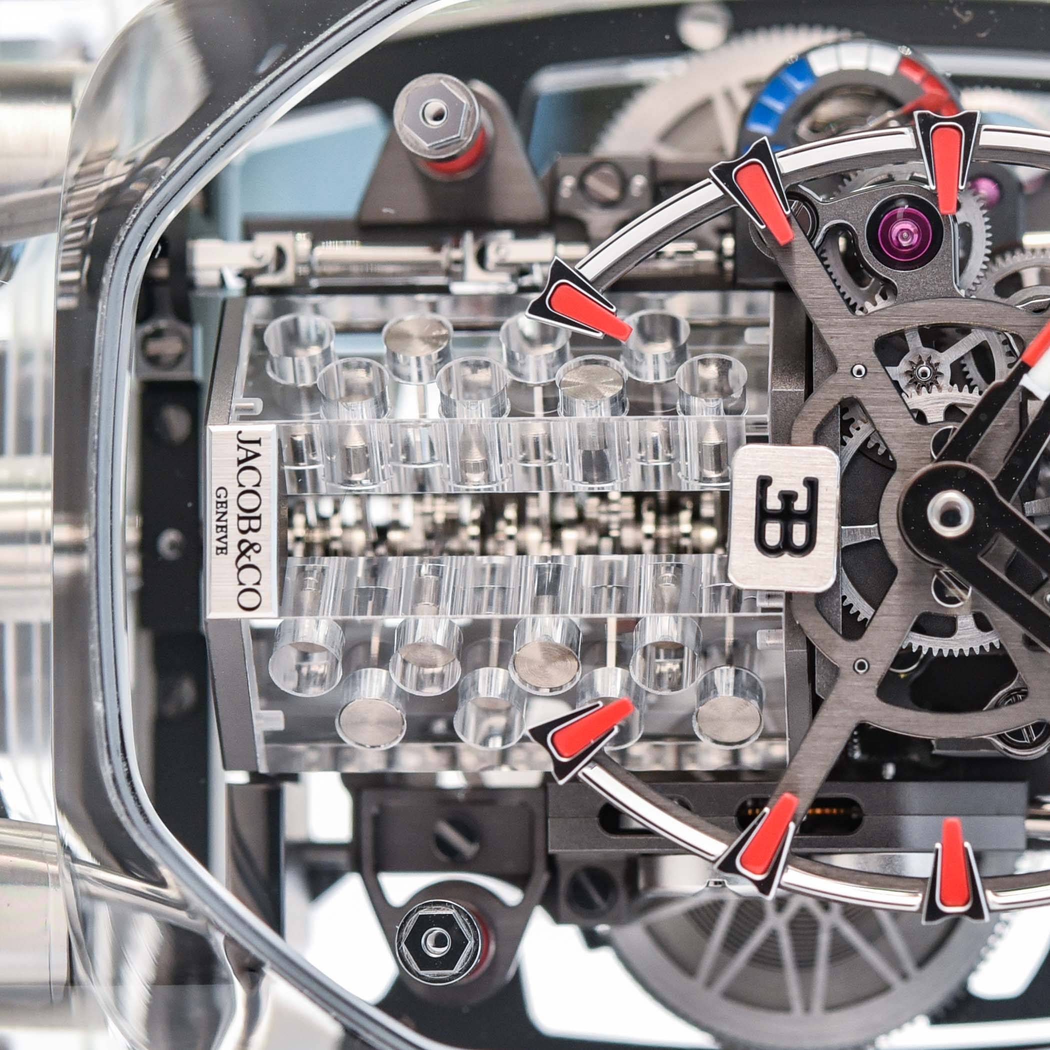 Evocative as it is from the outside, the complexity certainly matches the visual impact. The level of detail of the entire movement, the timing side and the automaton, is proper Haute Horlogerie. The manual wound movement uses no fewer than 578 components, including 51 jewels. Suspending the movement using working shock-absorbers posed a challenge for Jacob & Co., as you run the risk of damaging the linking to the stationary crowns upon impact. The solution was to use a patented automotive-style transverse system to allow for a bit of play while keeping everything connected neat and tidy. When fully wound through the left crown, the watch has a running time of 60 hours. This far exceeds the 20 minutes it takes the Bugatti Chiron to empty its tanks at full throttle, mind you, so plan your drive in advance.